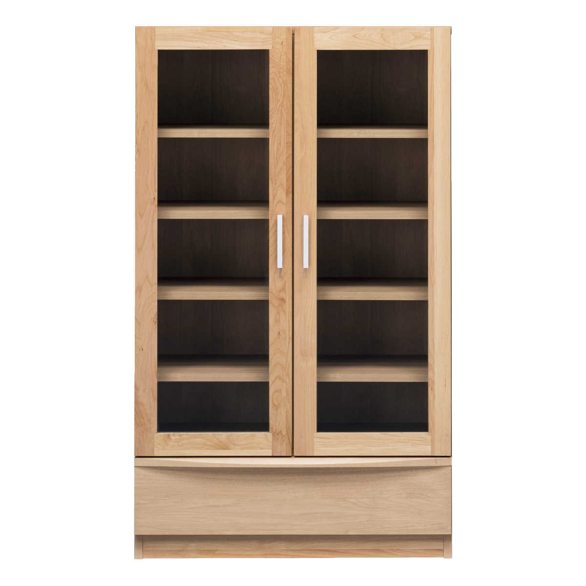 美しい木肌が特長のアルダー材を使用したガラス扉の本棚です。ガラス扉は、大切な書籍や趣味のコレクションなどをホコリから守ります。アルダー材は経年変化を楽しめ、長くお使いいただけます。