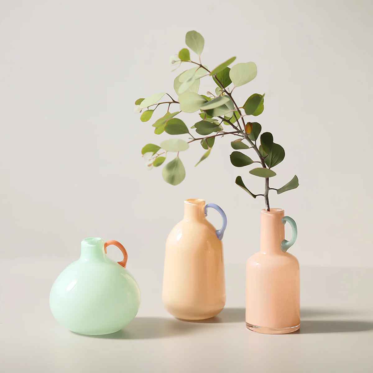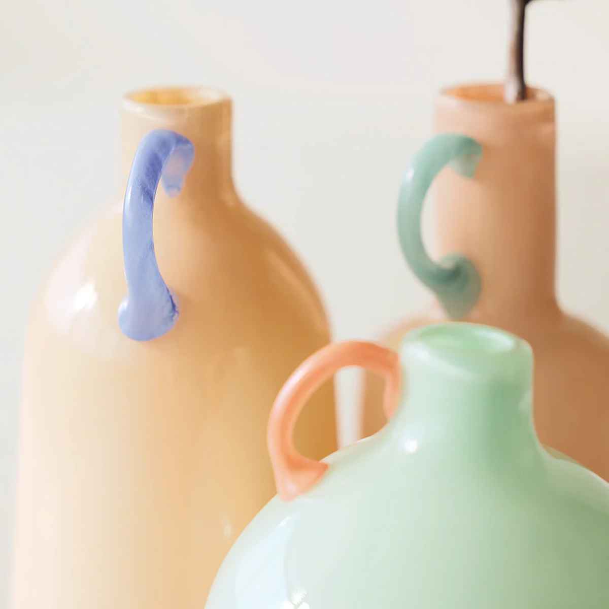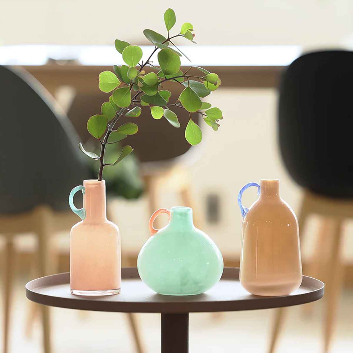 取っ手の曲線やボトルネックの長さがそれぞれ違って、手作業のようなあたたかさがあります。完璧すぎない、けれどどこか計算された形状は、ナチュラルな暮らしの中に静かな個性を添えてくれます。