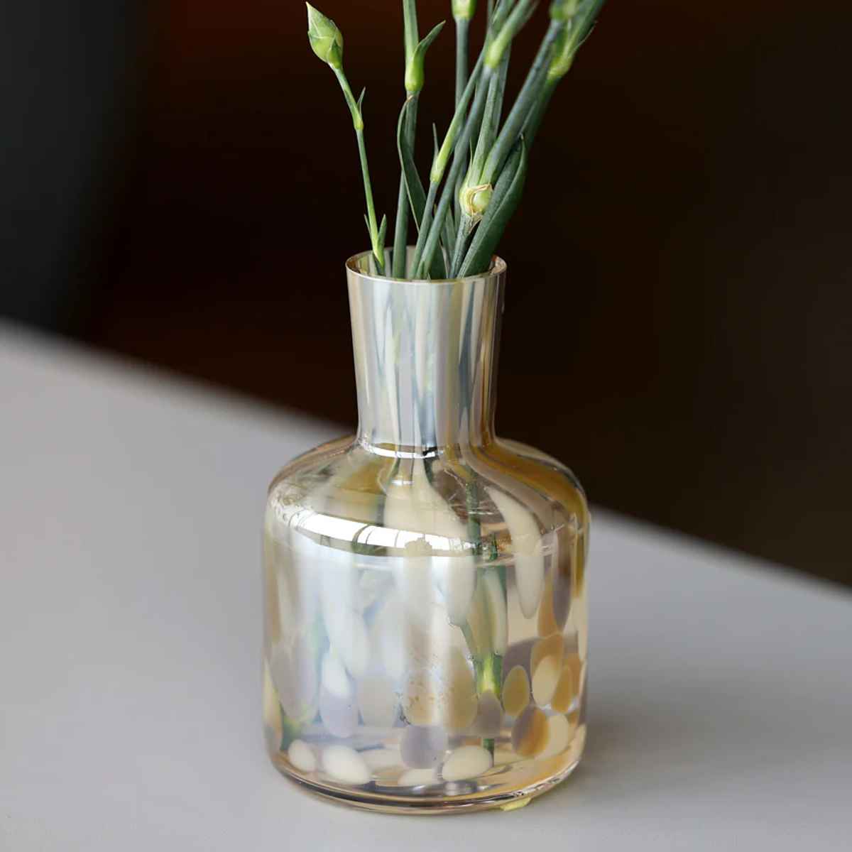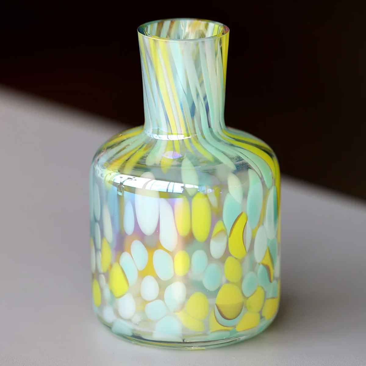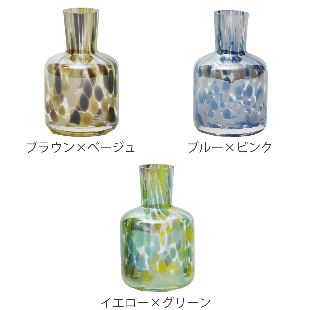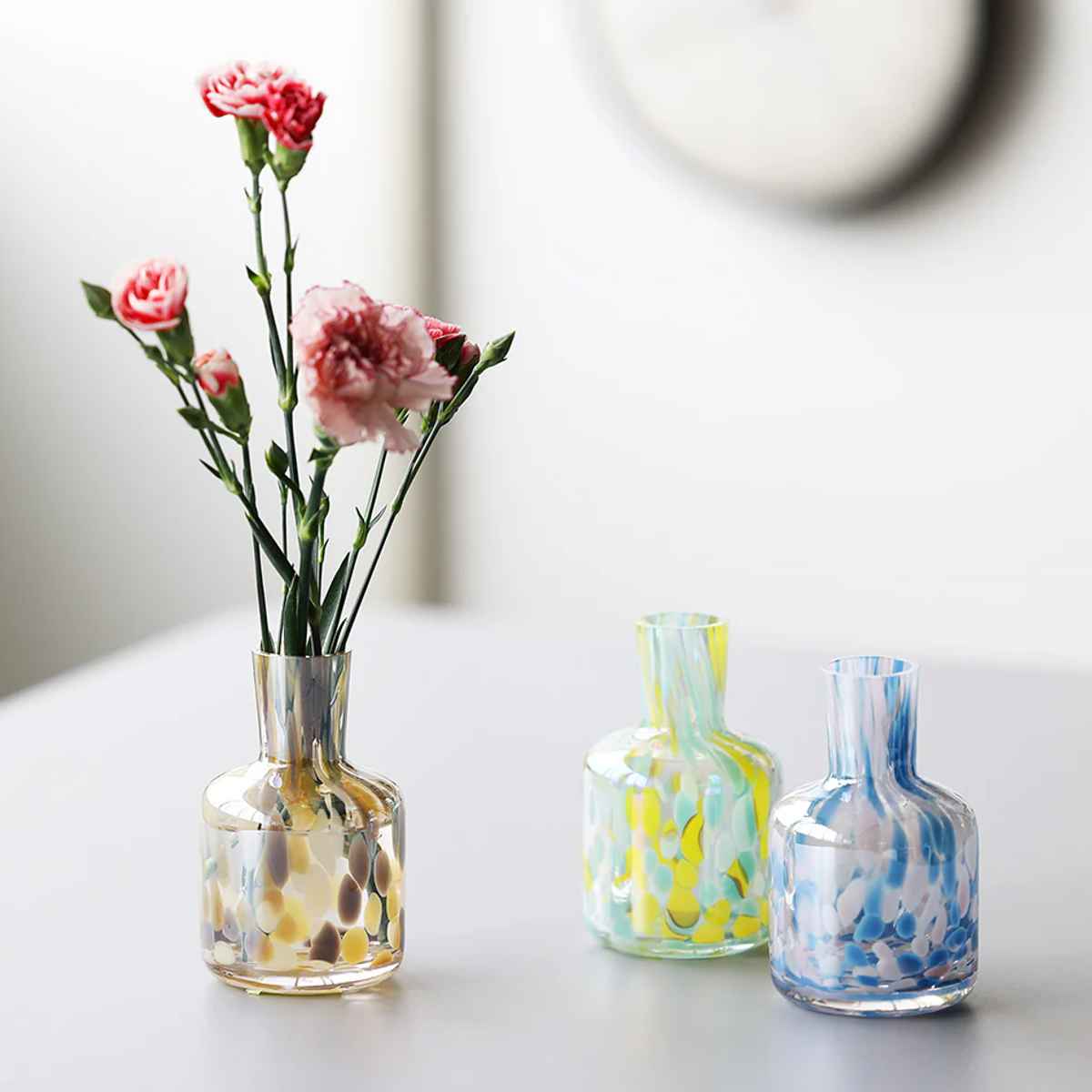 ドリッピングアートのような色鮮やかなガラスのフラワーベースです。花を無造作に挿すだけで綺麗にまとまり、空間に鮮やかなアクセントを添えます。