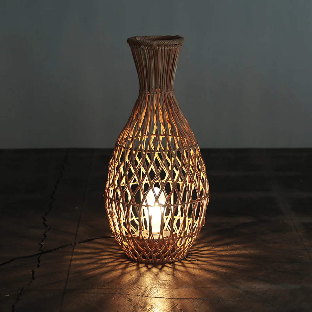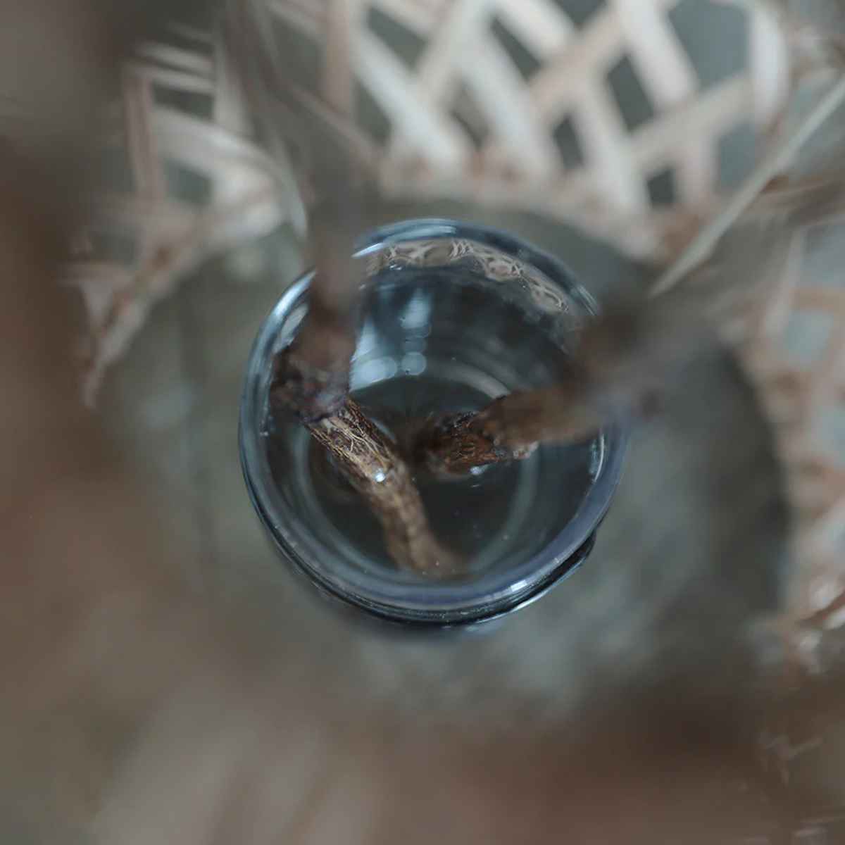 時間帯や光の角度によって変化する影の表情は、まるで自然が織りなすアートのような感動を添えてくれます。シンプルなガラスの筒も、ラタンの装飾によって温もりのあるオブジェへと昇華させます。
