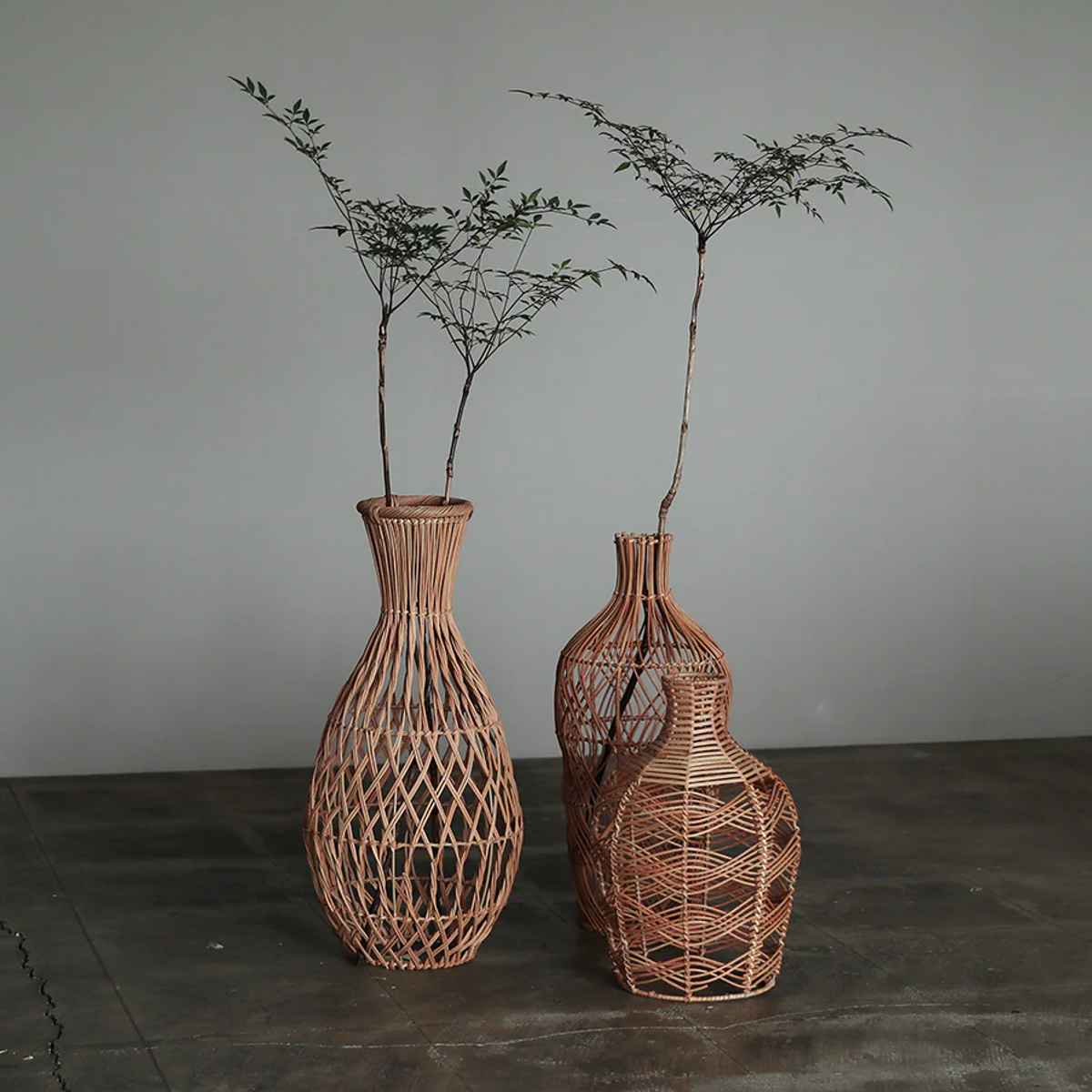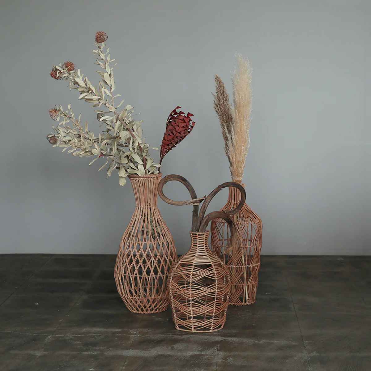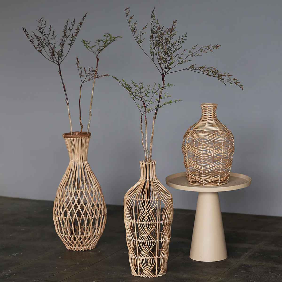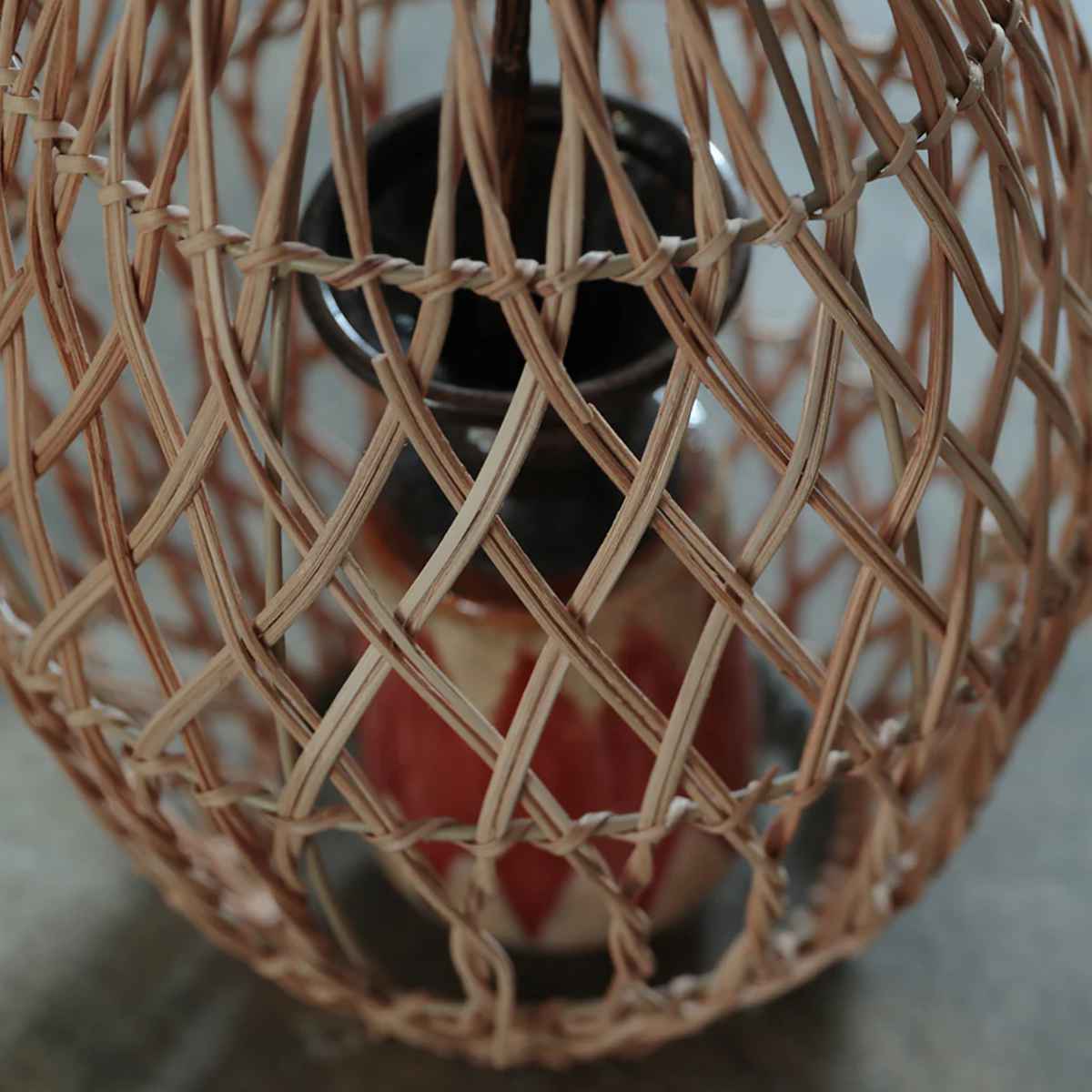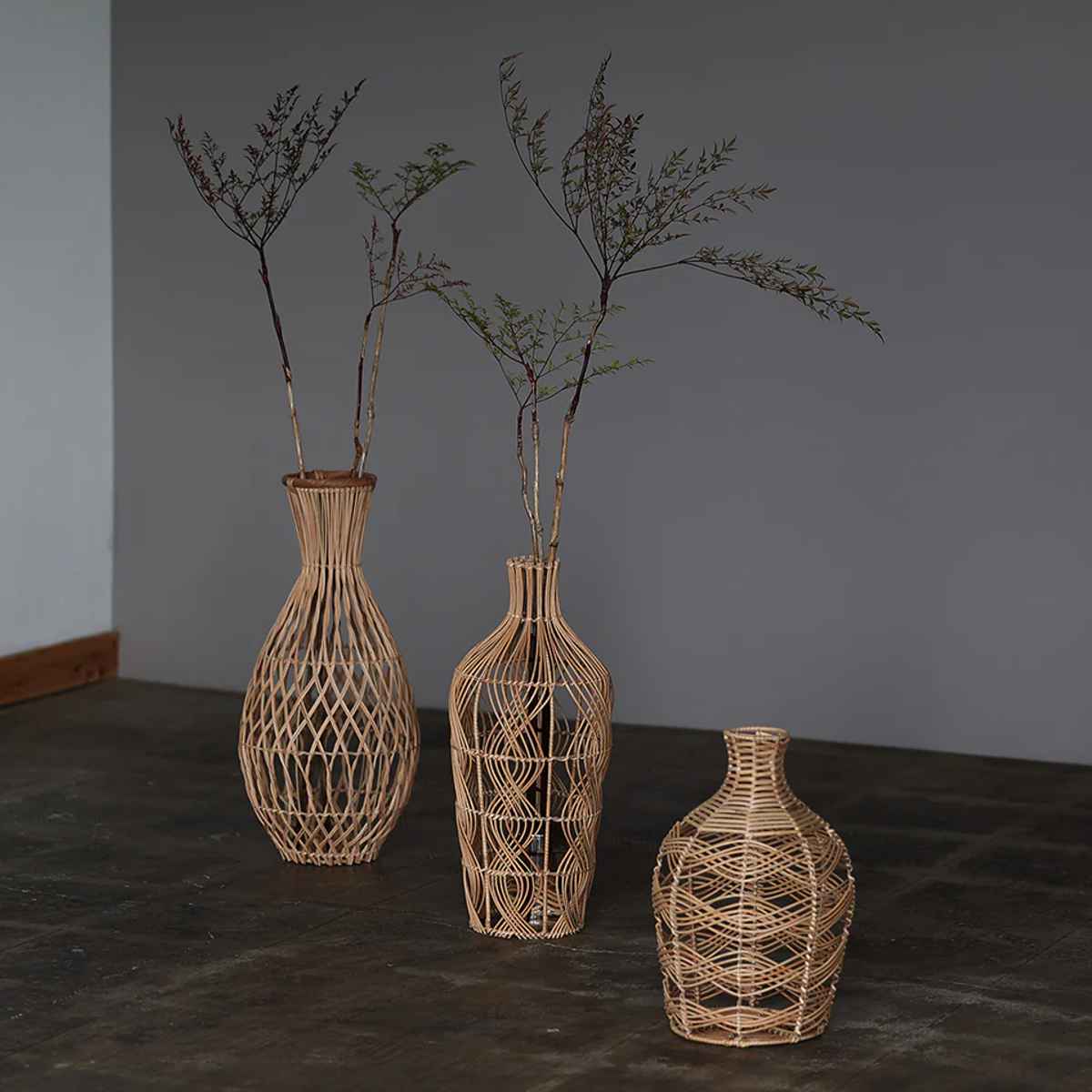 デザイン性のあるフラワーベースにもラタンの編み目が絶妙に調和し、内と外で二重の美しさを楽しむことができます。組み合わせによって表情が変わる点も魅力です。