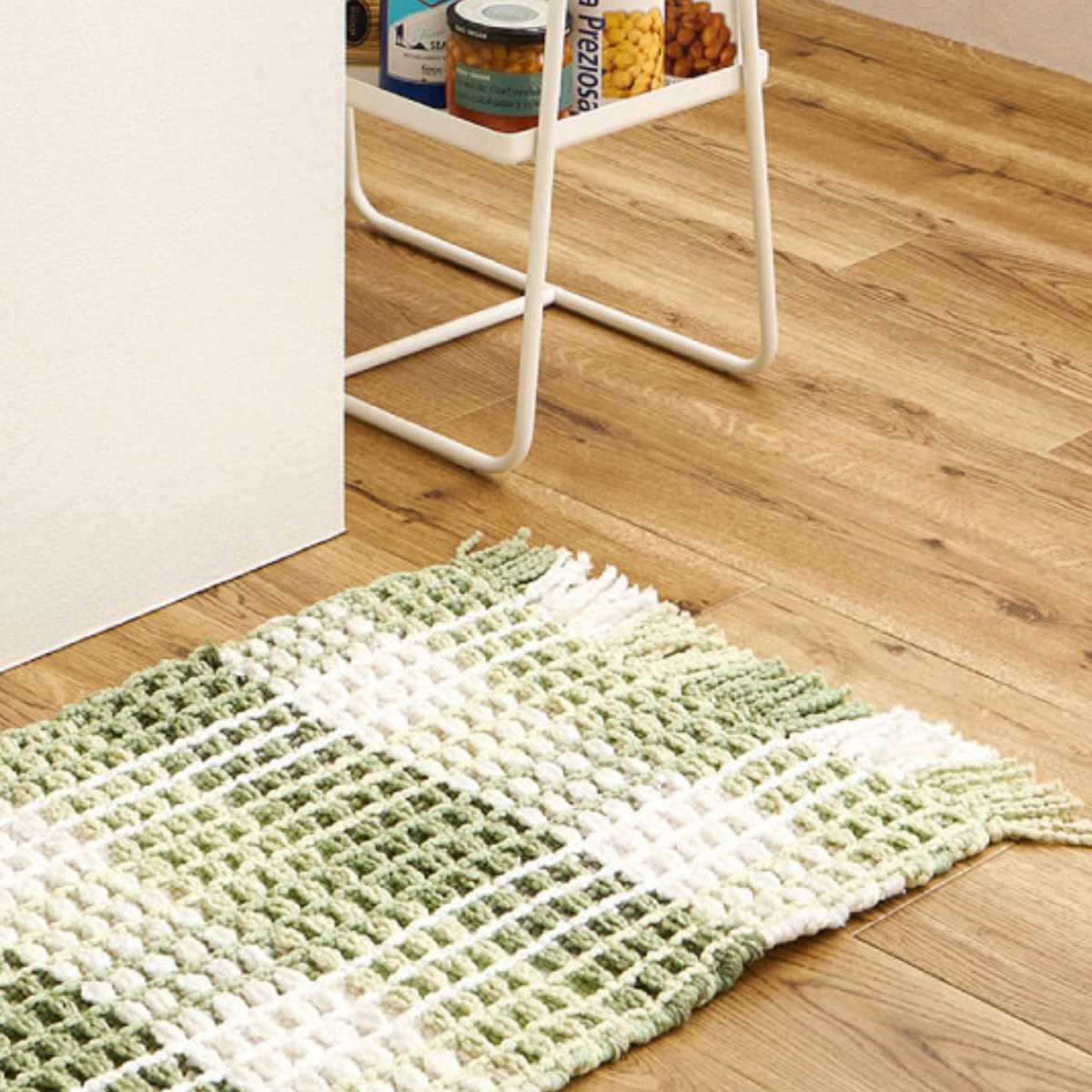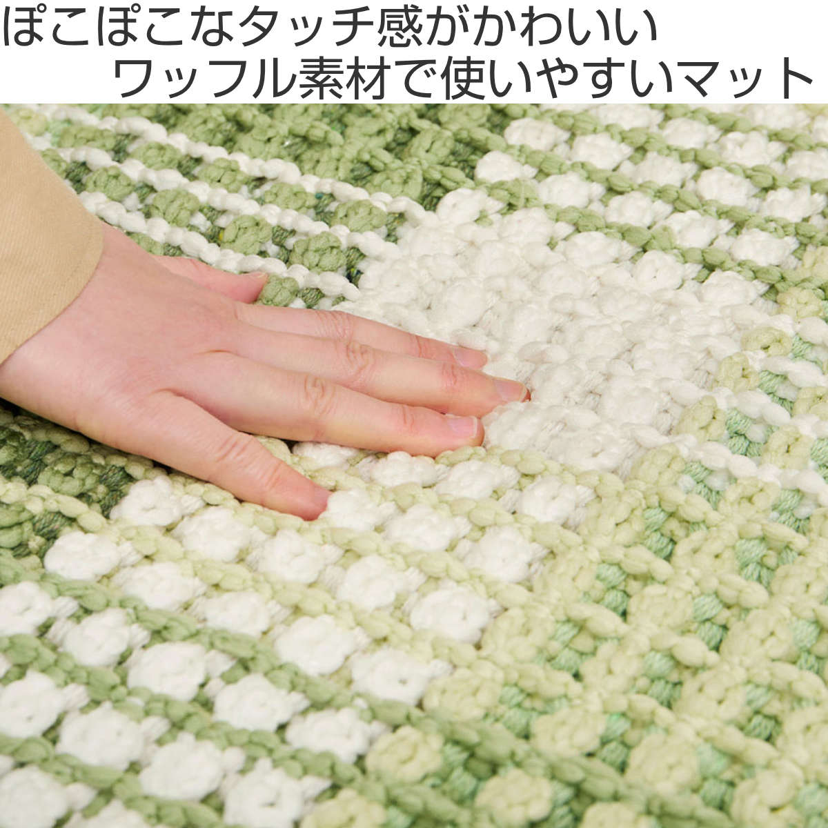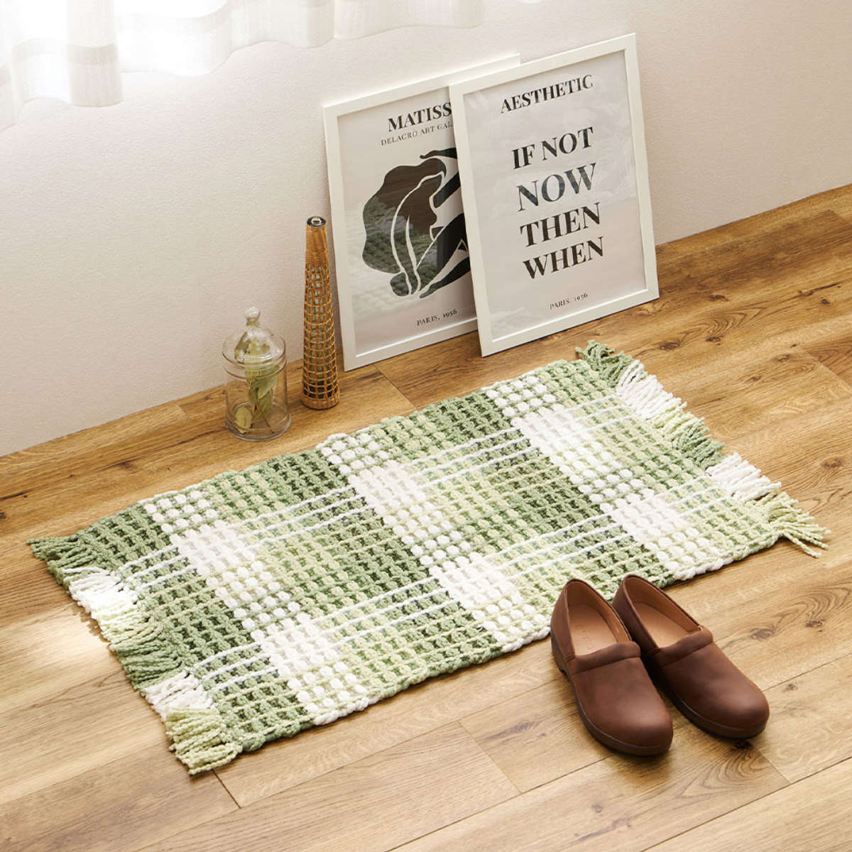 やわらかい糸を立体的に織り込んだワッフル風の玄関マット。さわやかなギンガムチェックのデザインで、おしゃれな雰囲気を演出してくれます。