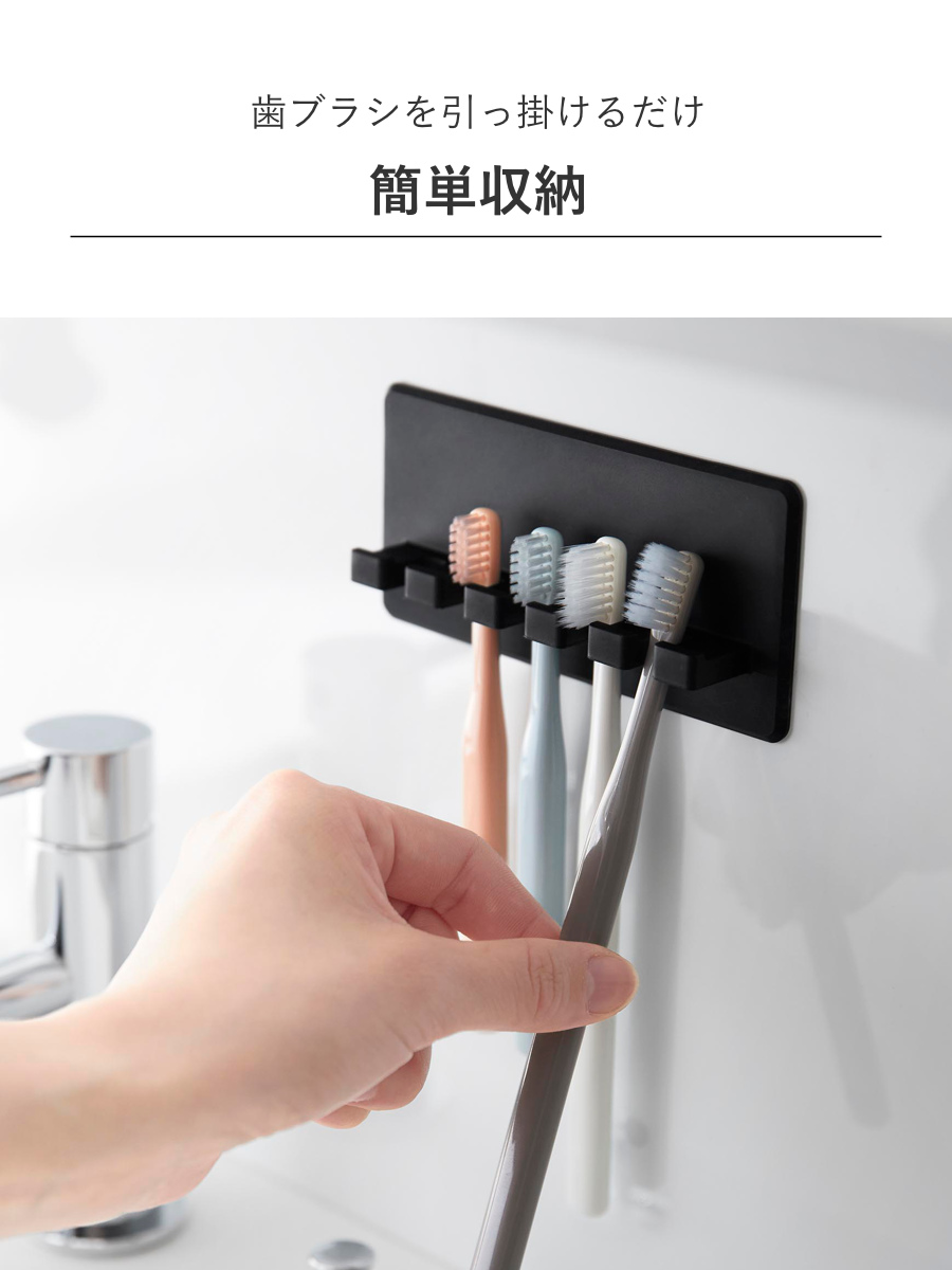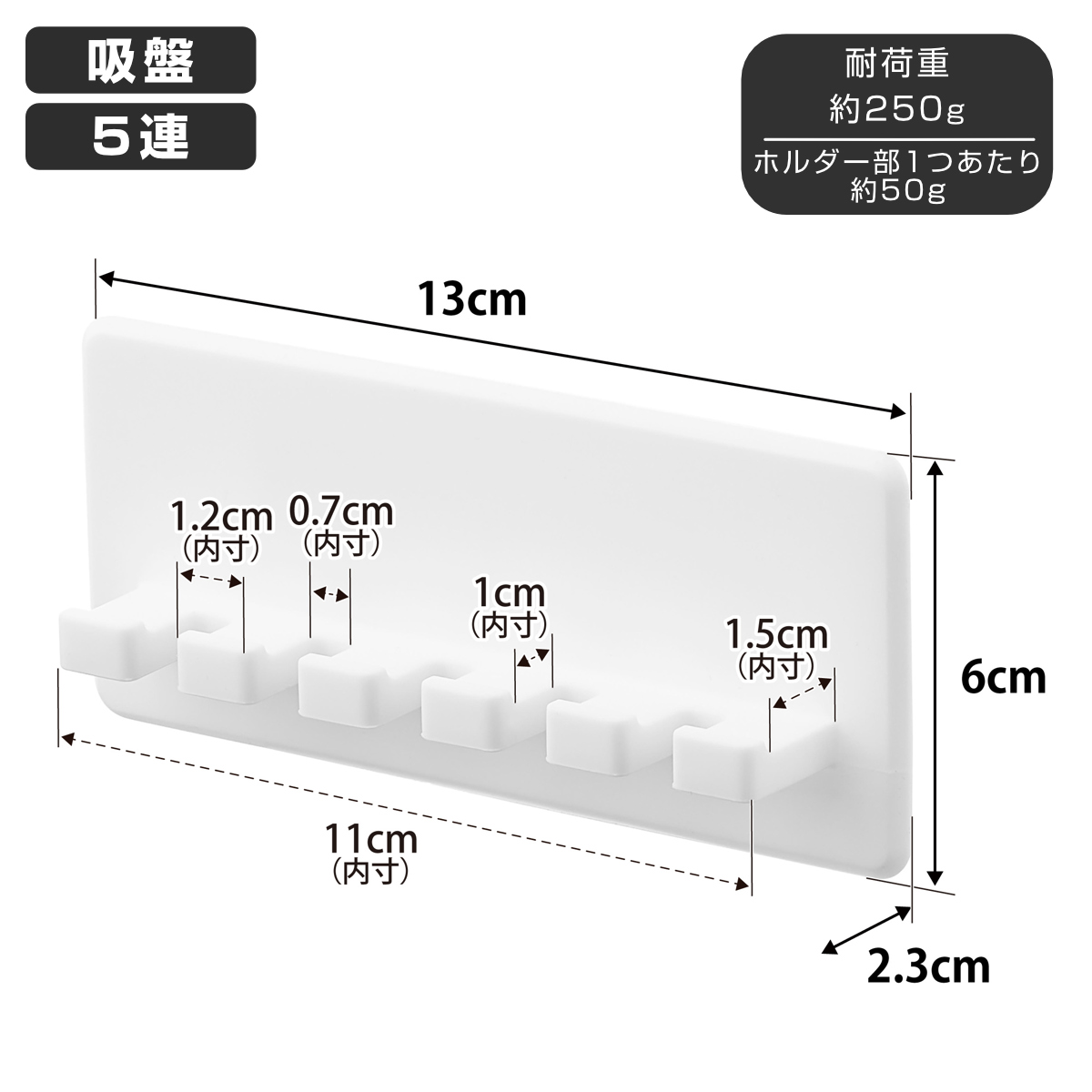 シリコーン吸盤で貼り付けるだけで設置できる歯ブラシホルダー 5連です。最大5本の歯ブラシを収納できます。浮かせて収納できるので通気性がよく衛生的です。