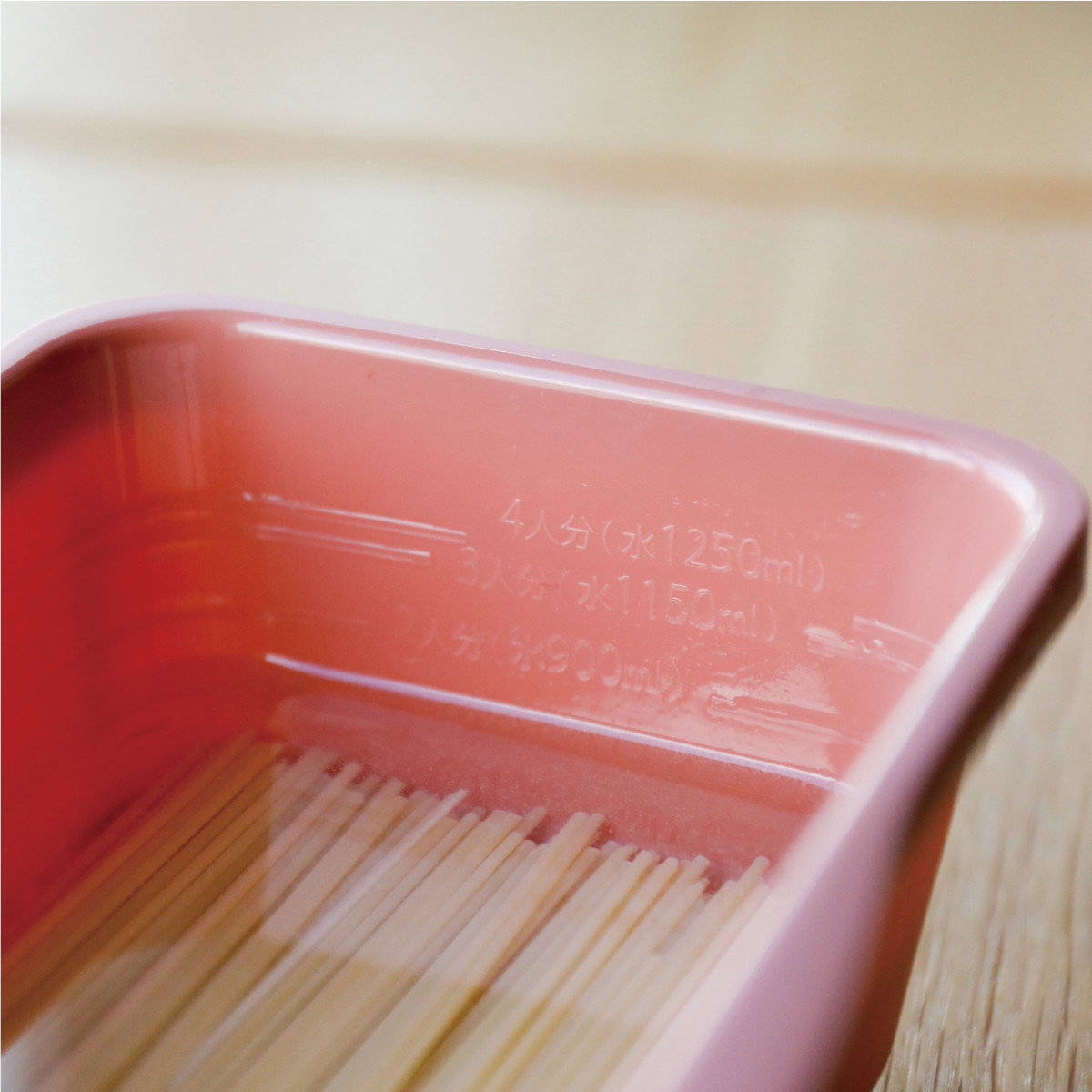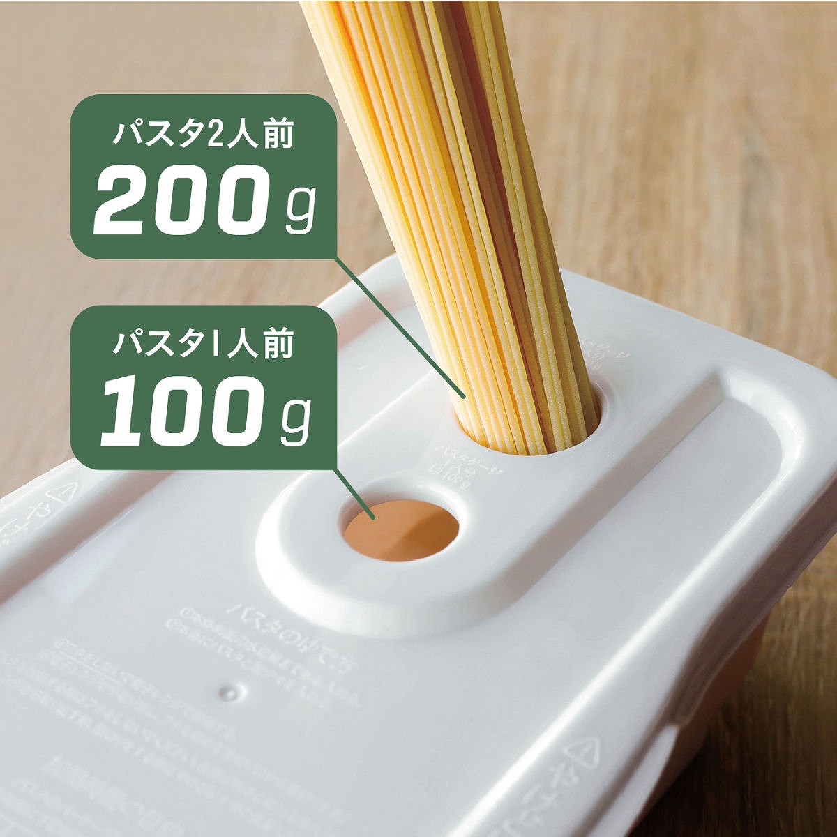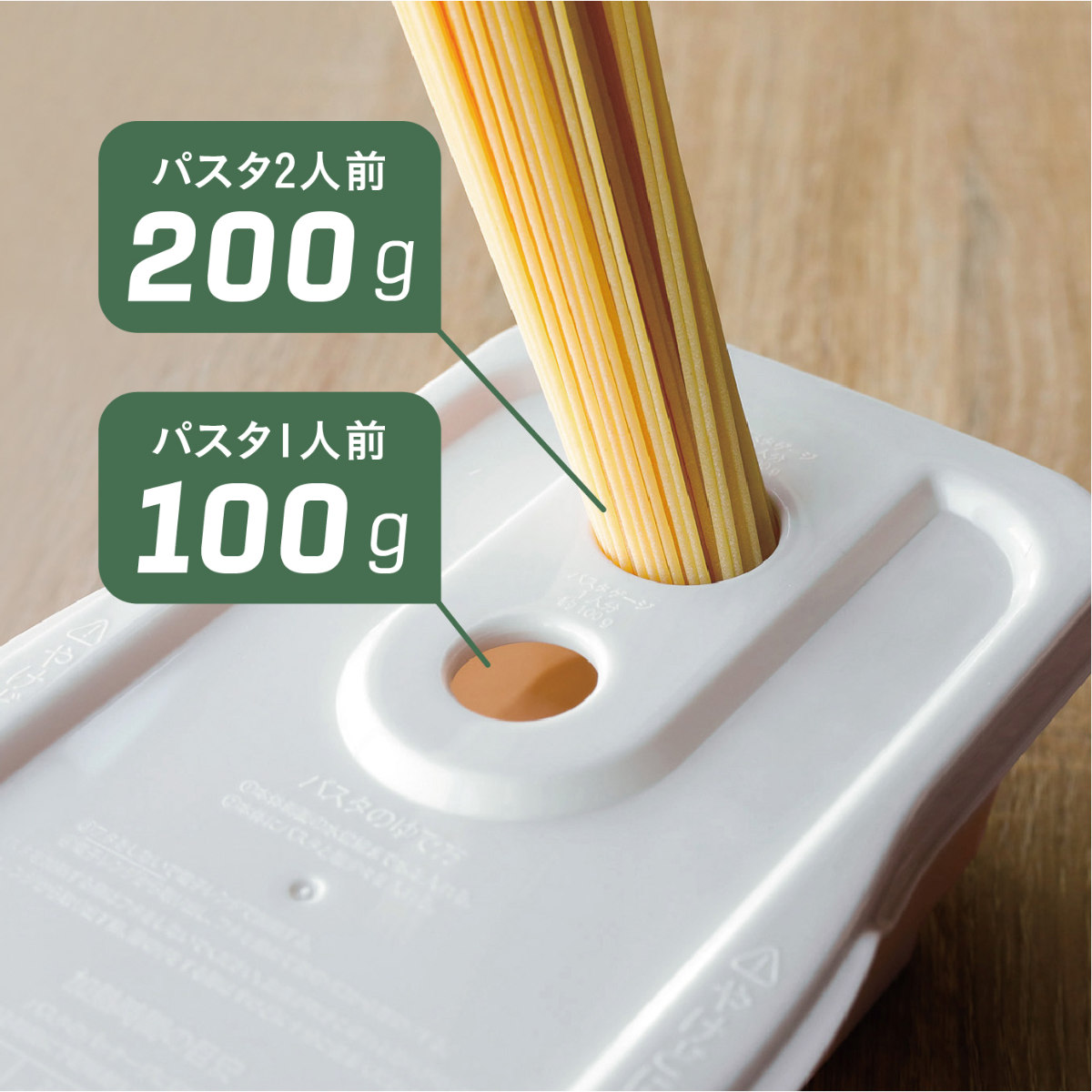 1人前~4人前まで対応するので、ひとり分はもちろん家族分も1回で作れます。また、蓋にはパスタゲージがあり、100g(1人分)と200g(2人分)の計量ができます。