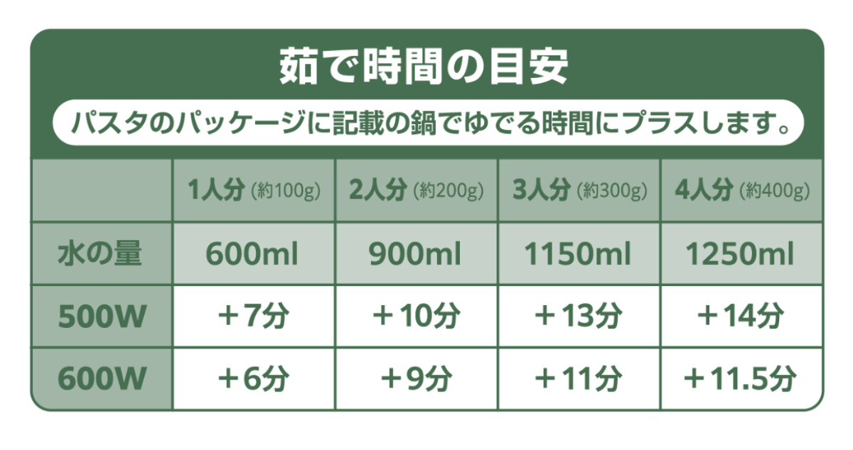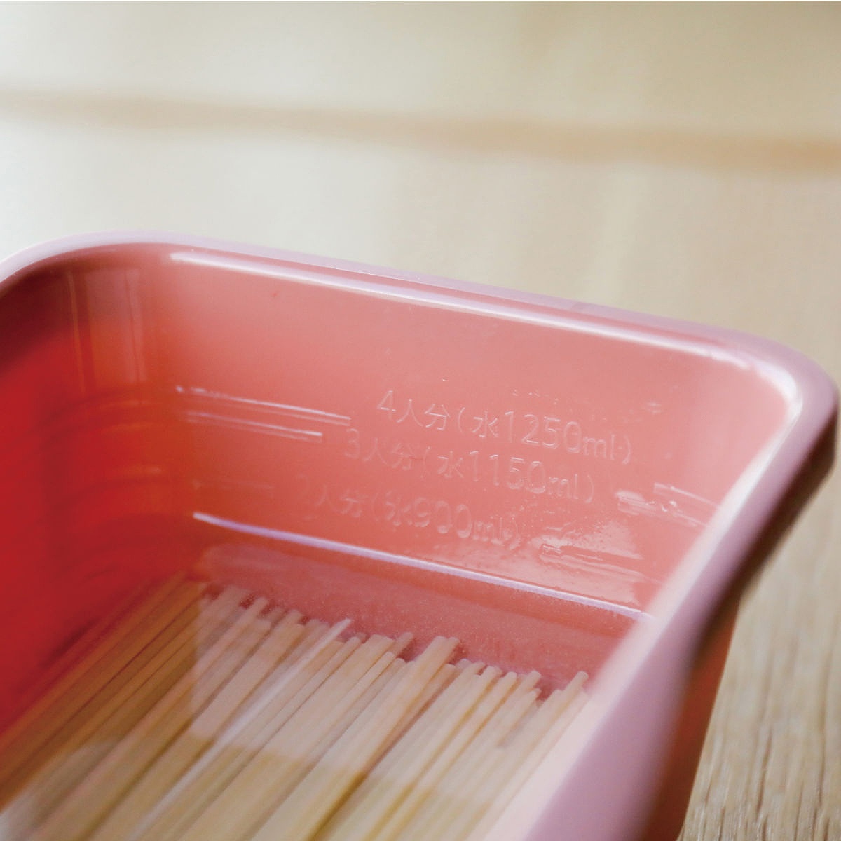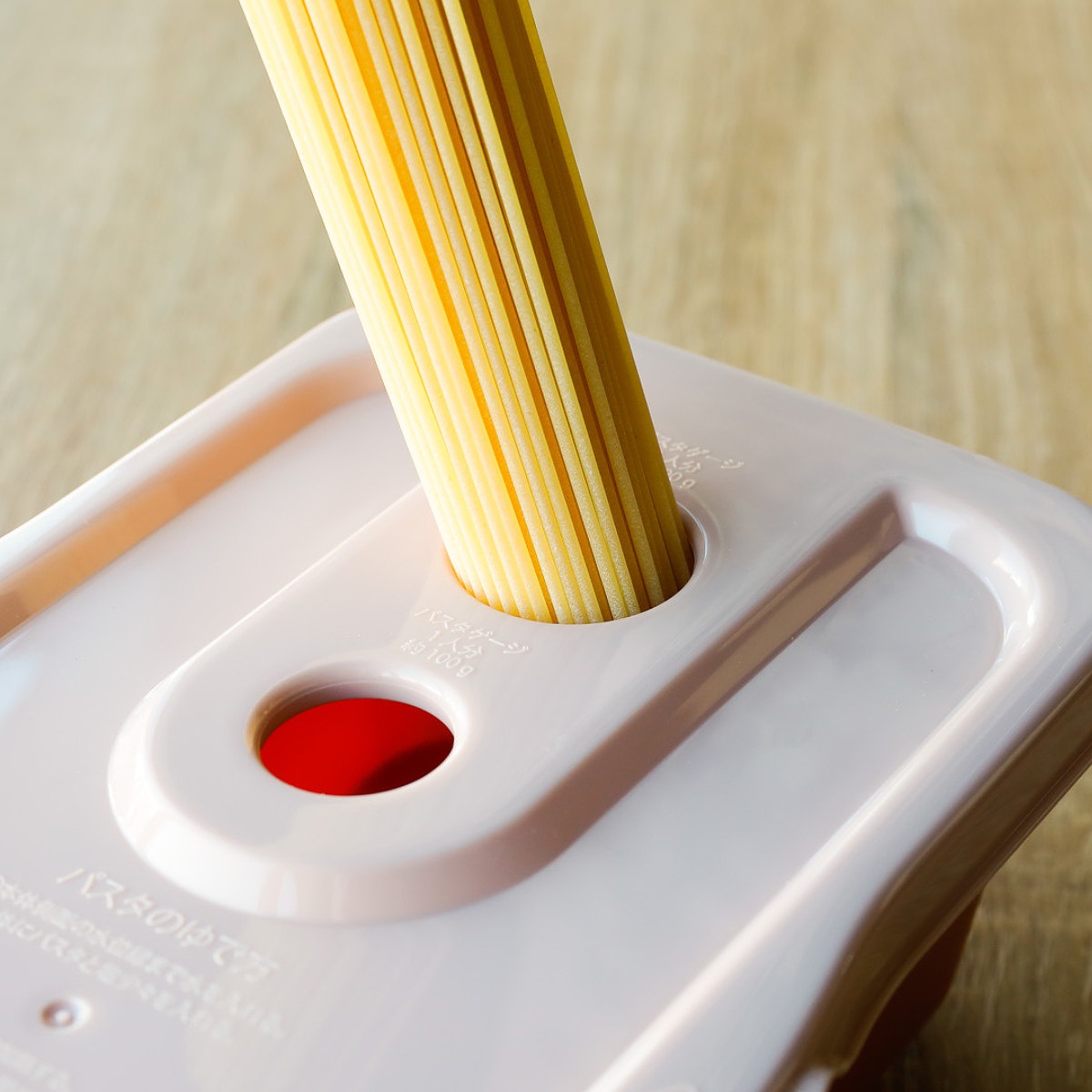 1人前~4人前まで対応するので、ひとり分はもちろん家族分も1回で作れます。また、蓋にはパスタゲージがあり、100g(1人分)と200g(2人分)の計量ができます。