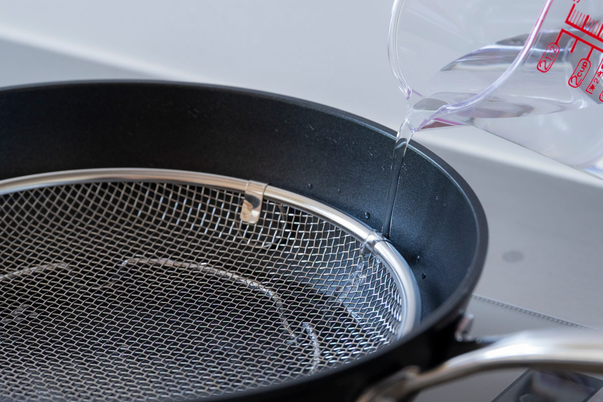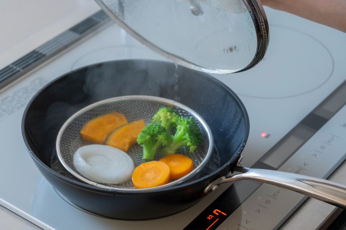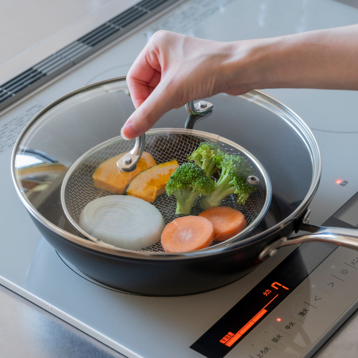 高さ約1.5cmの脚付きで、下に食器や食材がつかず衛生的です。通気性も上がるため乾きが早いのも嬉しいポイントです。蒸し調理の際も食材が水につかりにくく、快適にご使用いただけます。