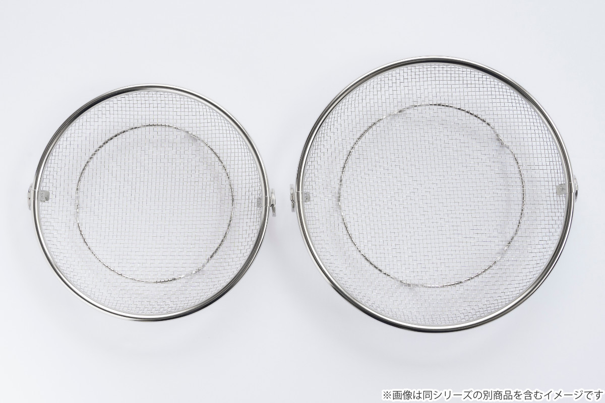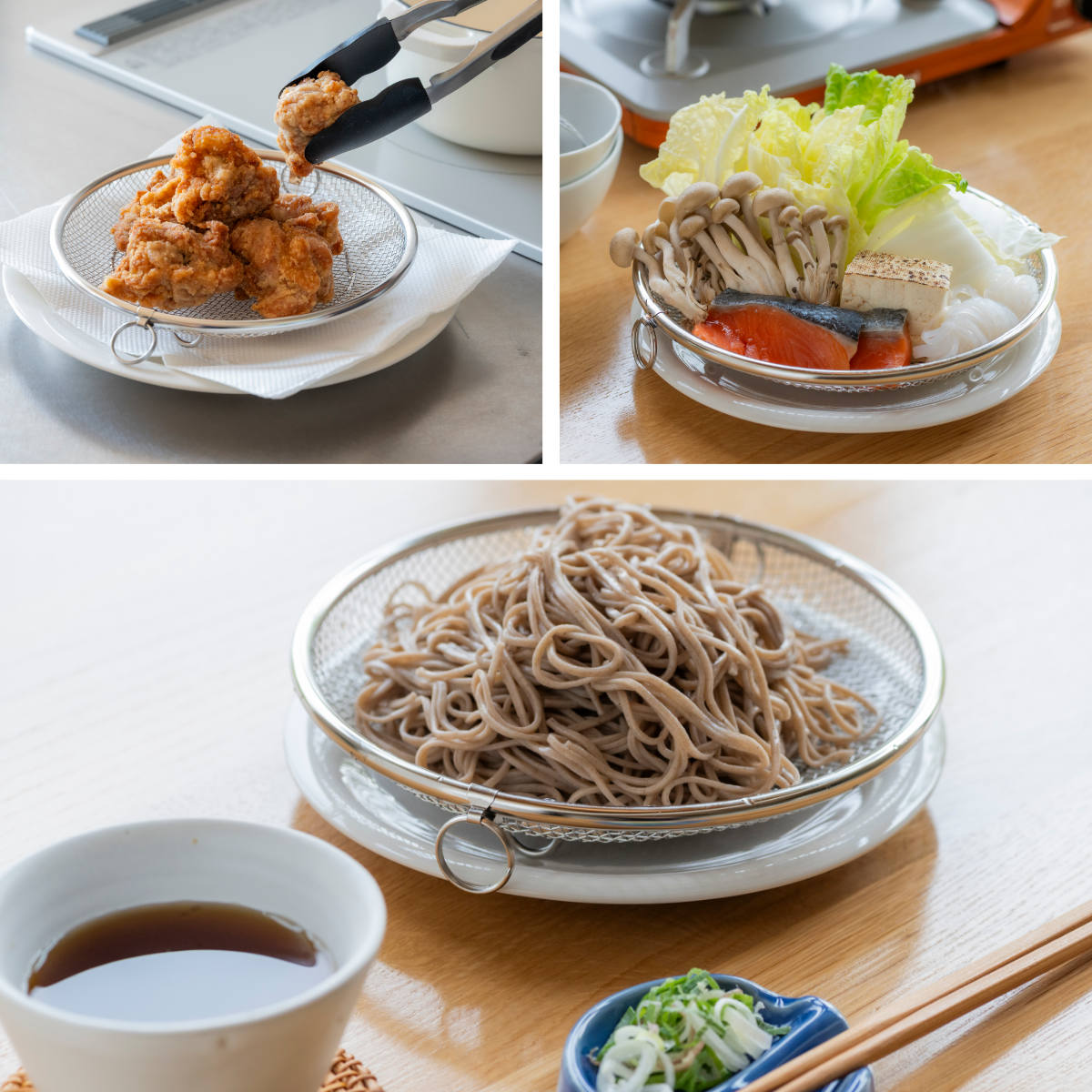 揚げ物や麺料理、鍋料理などさまざまな用途でお使いいただける盆ざるは、取っ手のないシンプルなデザインで調理後そのまま食卓に出しても邪魔になりません。