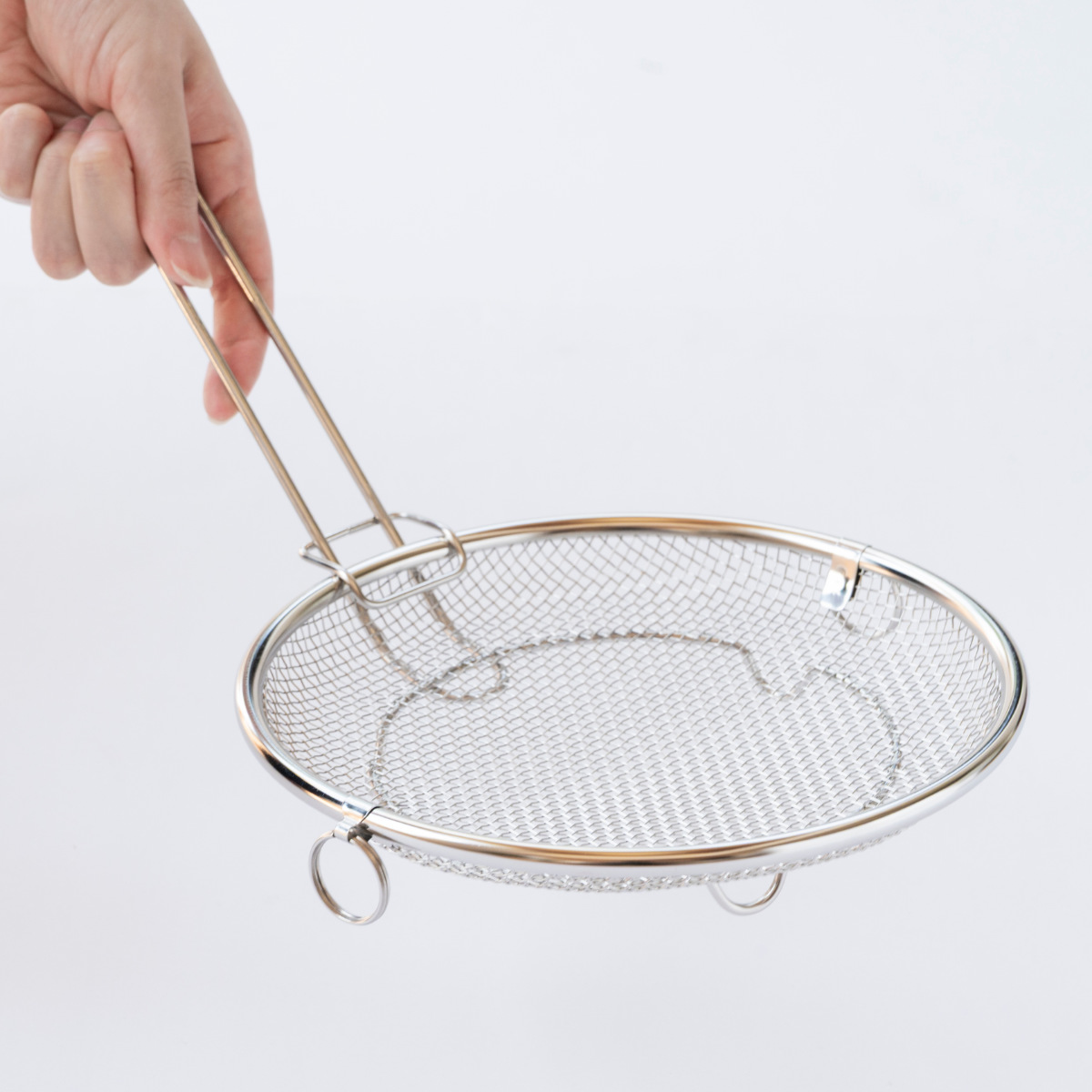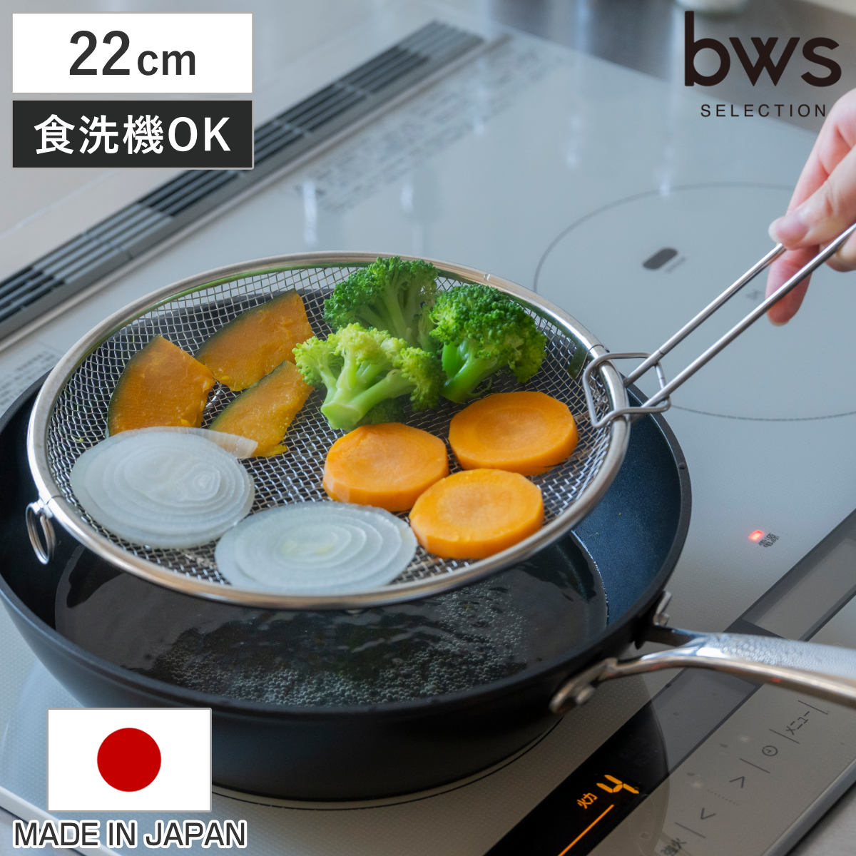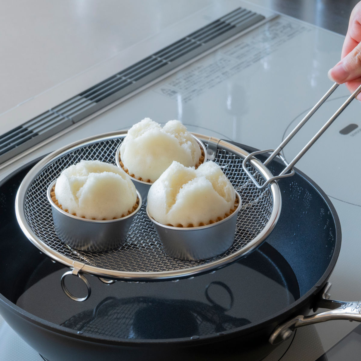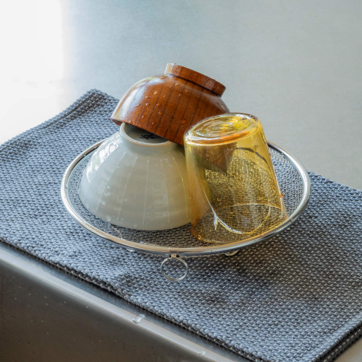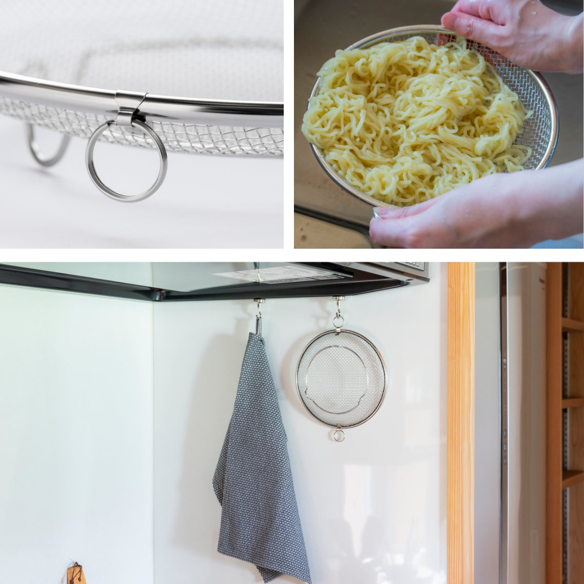 必要な時だけサッと取り出して使える脚付きの盆ざるです。鍋やフライパンにすっきり収まるデザインなので、食器の水切りから麺料理、揚げ物、お鍋の具材、蒸し料理まで幅広くお使いいただけます。