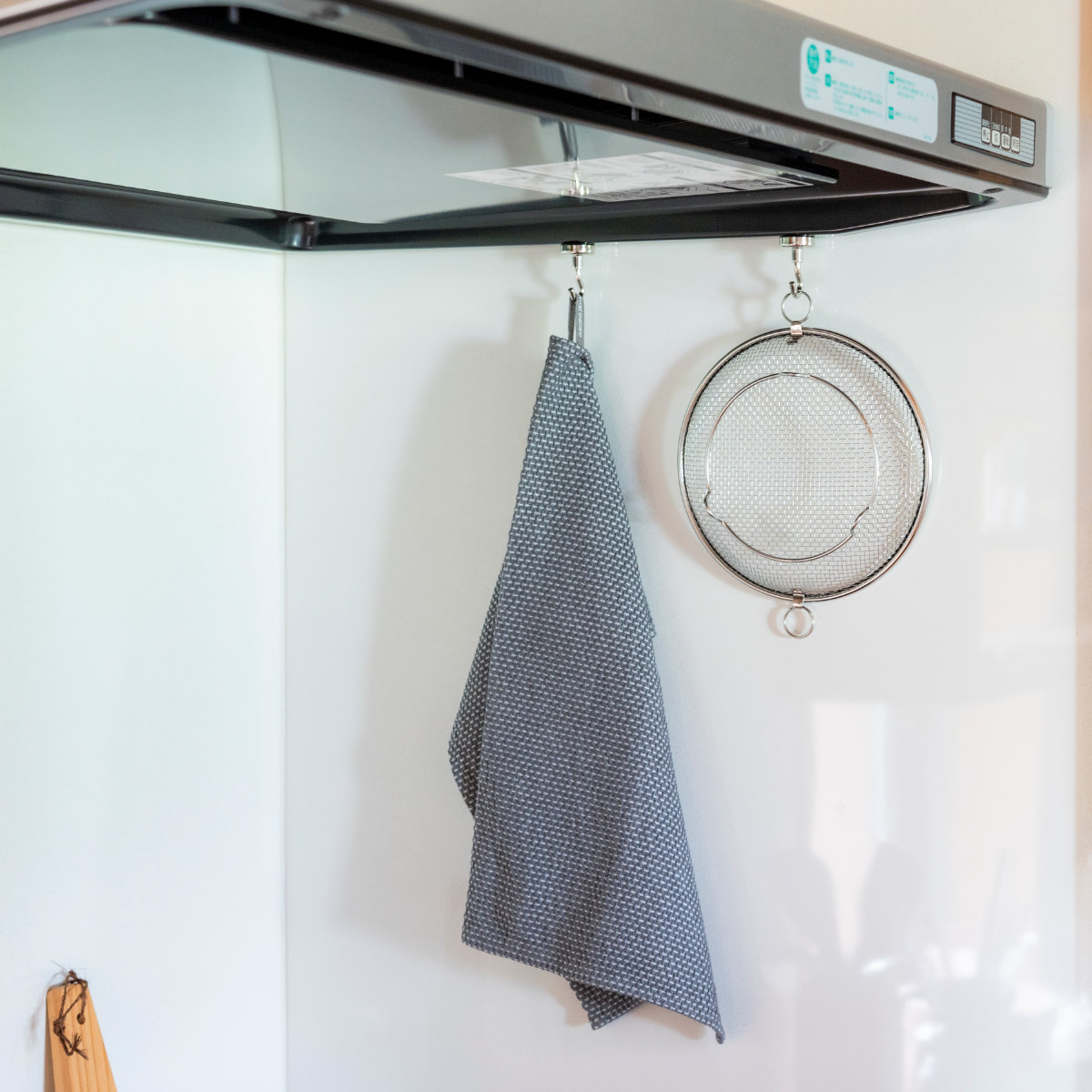 両側にリングが付いているので、水切りの際もしっかり振れて安心。収納時には引っ掛けてすっきり片付けられます。