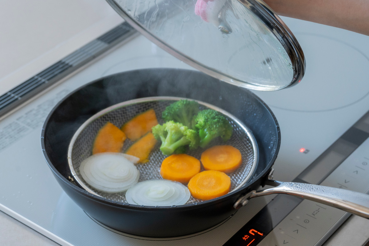 高さ約1.5cmの脚付きで、下に食器や食材がつかず衛生的です。通気性も上がるため乾きが早いのも嬉しいポイントです。蒸し調理の際も食材が水につかりにくく、快適にご使用いただけます。
