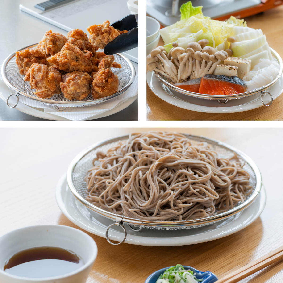 必要な時だけサッと取り出して使える脚付きの盆ざるです。鍋やフライパンにすっきり収まるデザインなので、食器の水切りから麺料理、揚げ物、お鍋の具材、蒸し料理まで幅広くお使いいただけます。