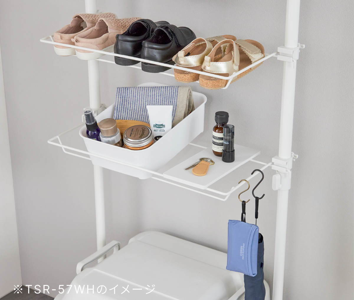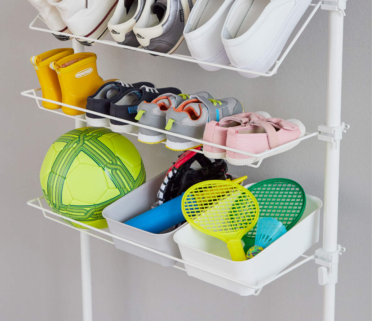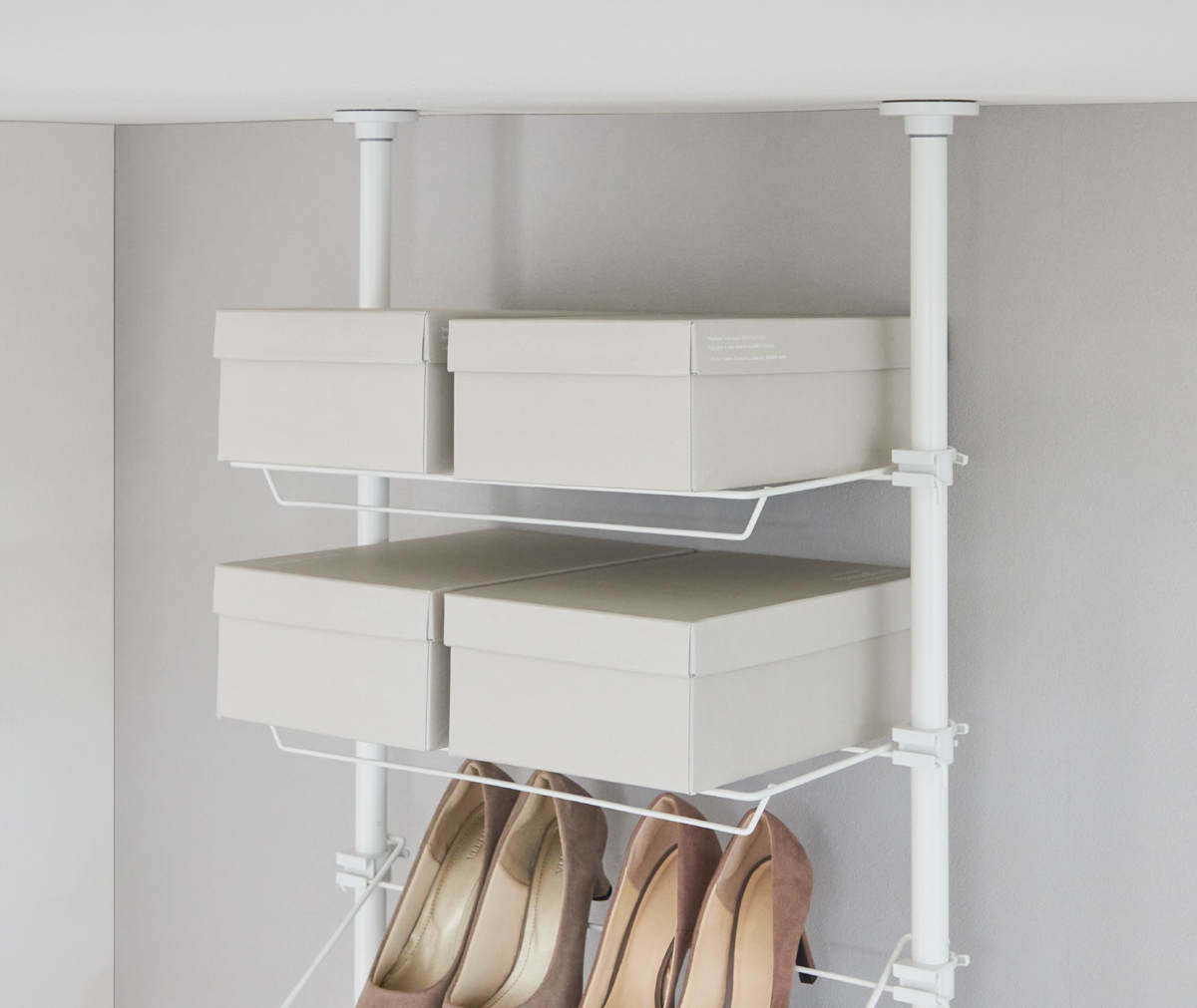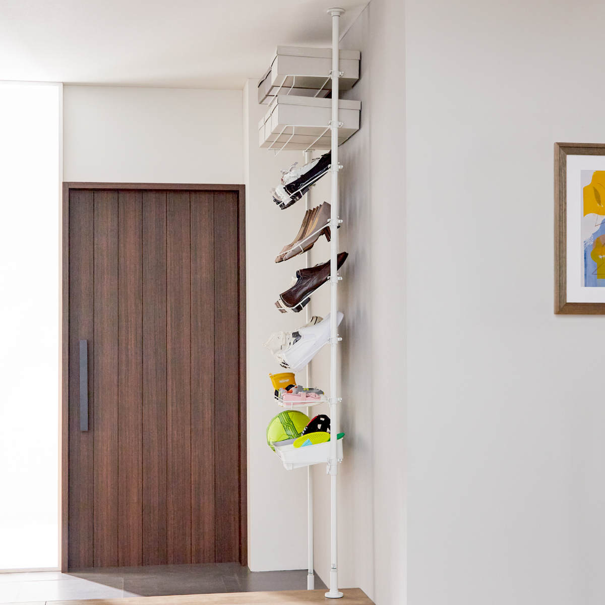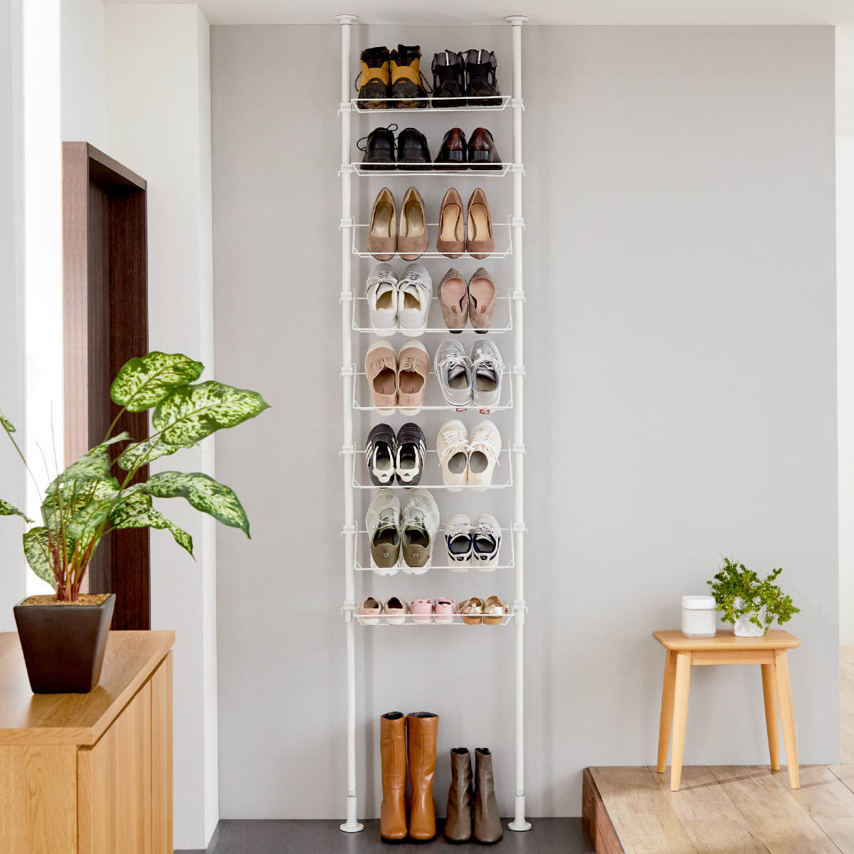 ついつい玄関に散らかってしまう靴を、効率良く収納できる突っ張りタイプのシューズラックです。玄関の縦のスペースを活用して、最大16足をすっきりと気持ちよく収納できます。