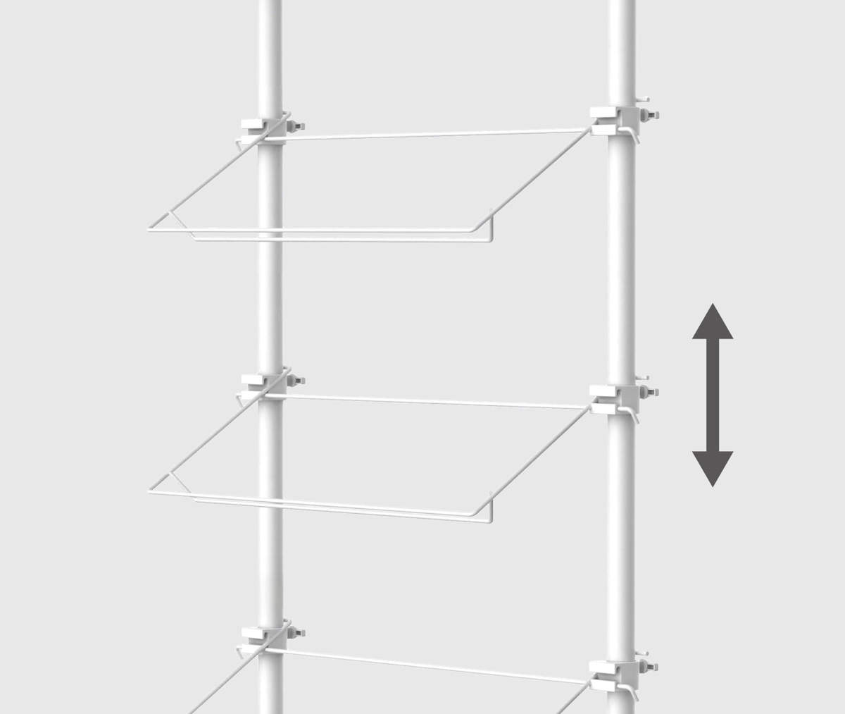 | 材質 | 支柱、パイプ棚:鉄、エポキシ樹脂粉体塗装 樹脂部品:ABS樹脂、合成ゴム バネ:バネ鋼、 メッキ ねじ類:鉄、メッキ |
