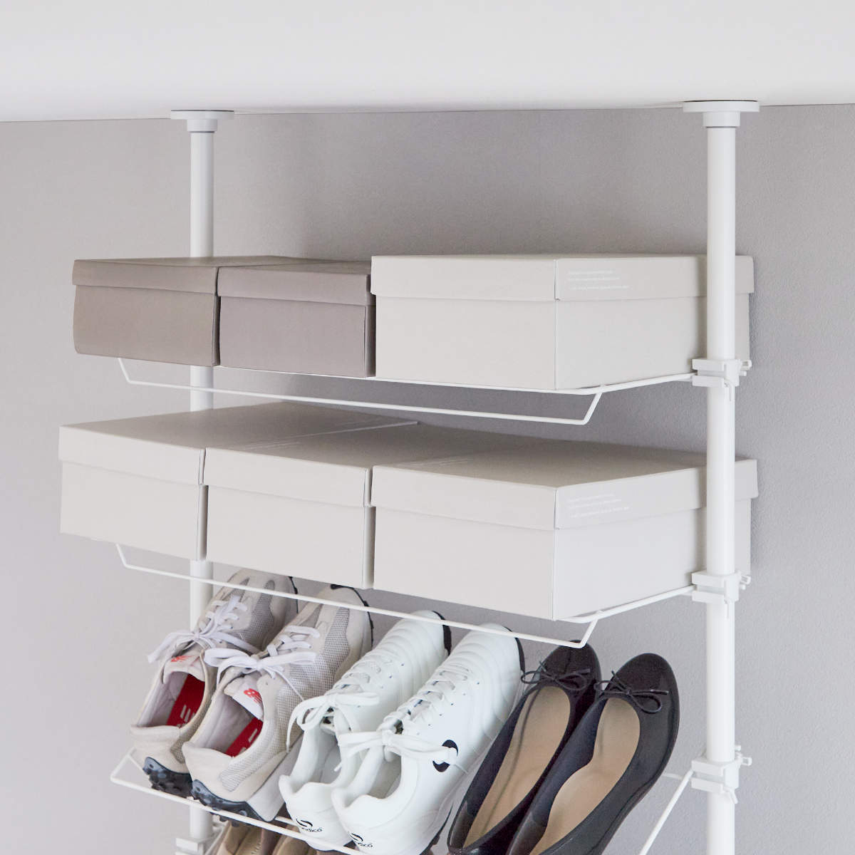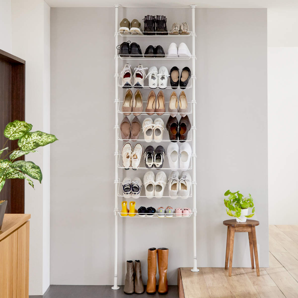 ついつい玄関に散らかってしまう靴を、効率良く収納できる突っ張りタイプのシューズラックです。玄関の縦のスペースを活用して、最大24足をすっきりと気持ちよく収納できます。