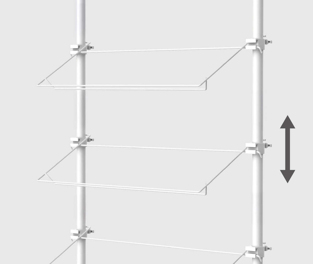 | 材質 | 支柱、パイプ棚:鉄、エポキシ樹脂粉体塗装 樹脂部品:ABS樹脂、合成ゴム バネ:バネ鋼、 メッキ ねじ類:鉄、メッキ |