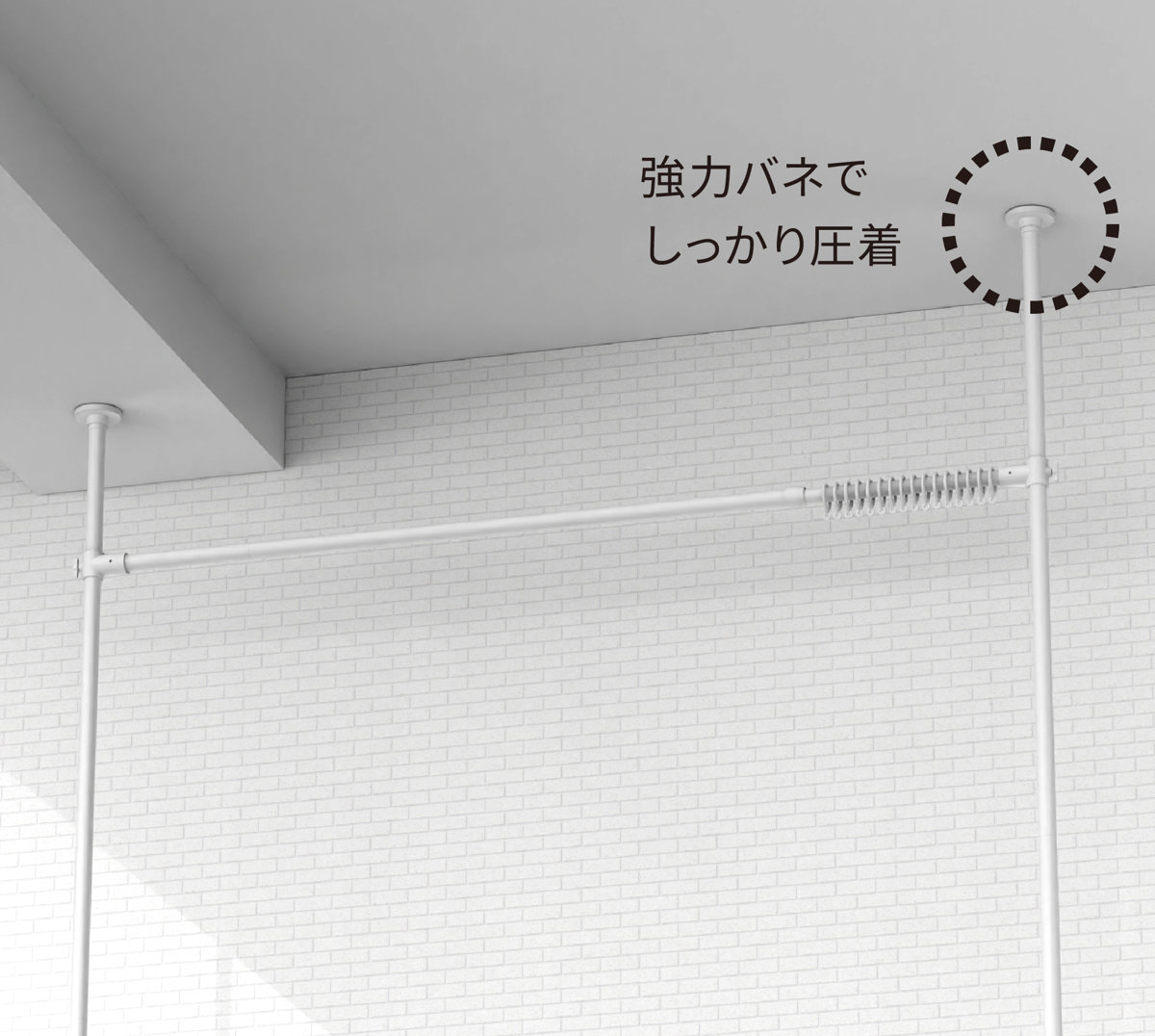 工事不要で設置できる安定感のある突っ張り式。床と天井にしっかり突っ張って固定することで、転倒防止対策はばっちりです。左右のポールそれぞれ独立して突っ張るので、梁や段差があっても設置が可能です。
