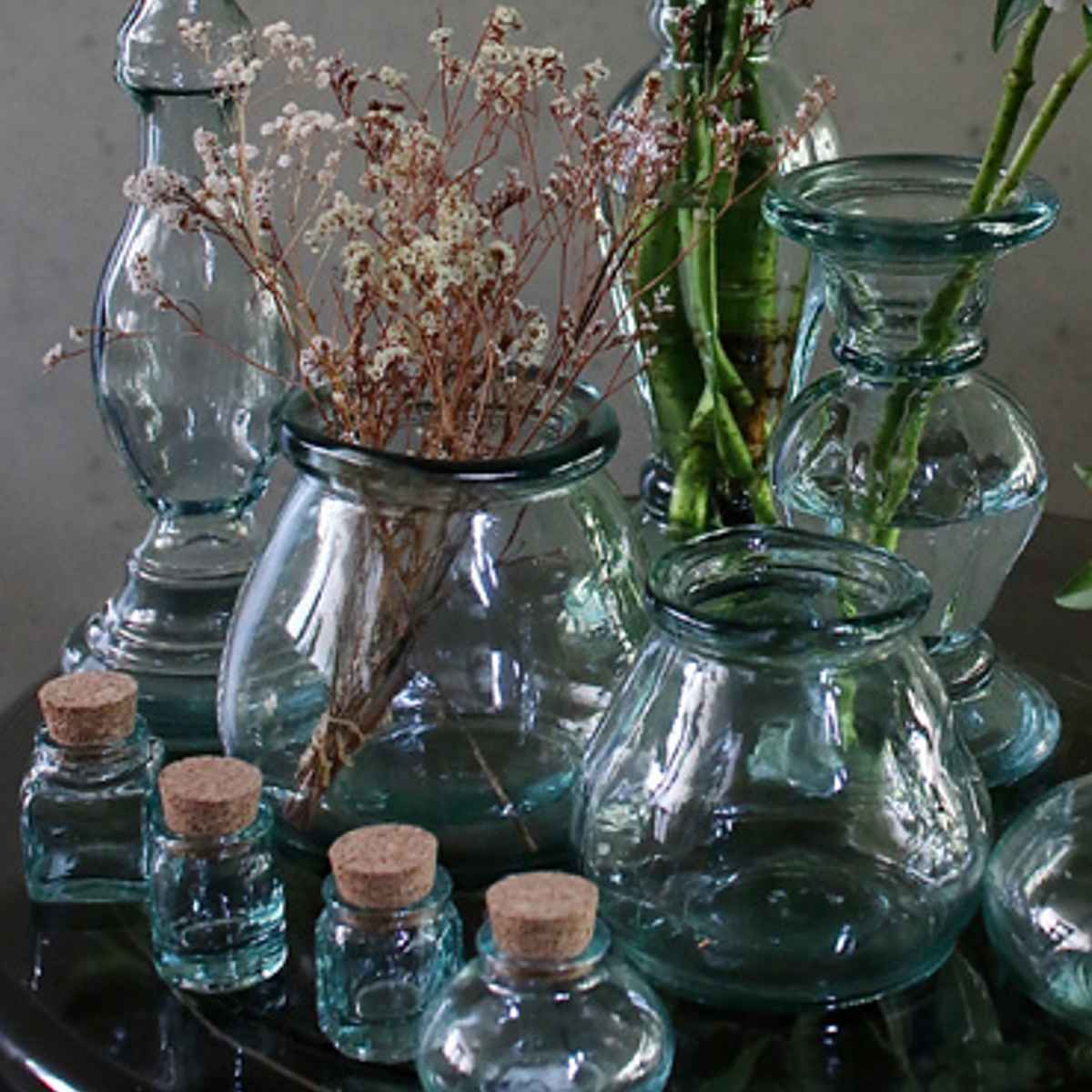 リサイクルガラスならではの絶妙な色合いが魅力で、光に反射すると繊細な表情を生み出します。ぽってりとした丸みと手を加えたような歪みがポイント。小さくて扱いやすいサイズ感なので一輪挿しやドライフラワーにぴったりです。