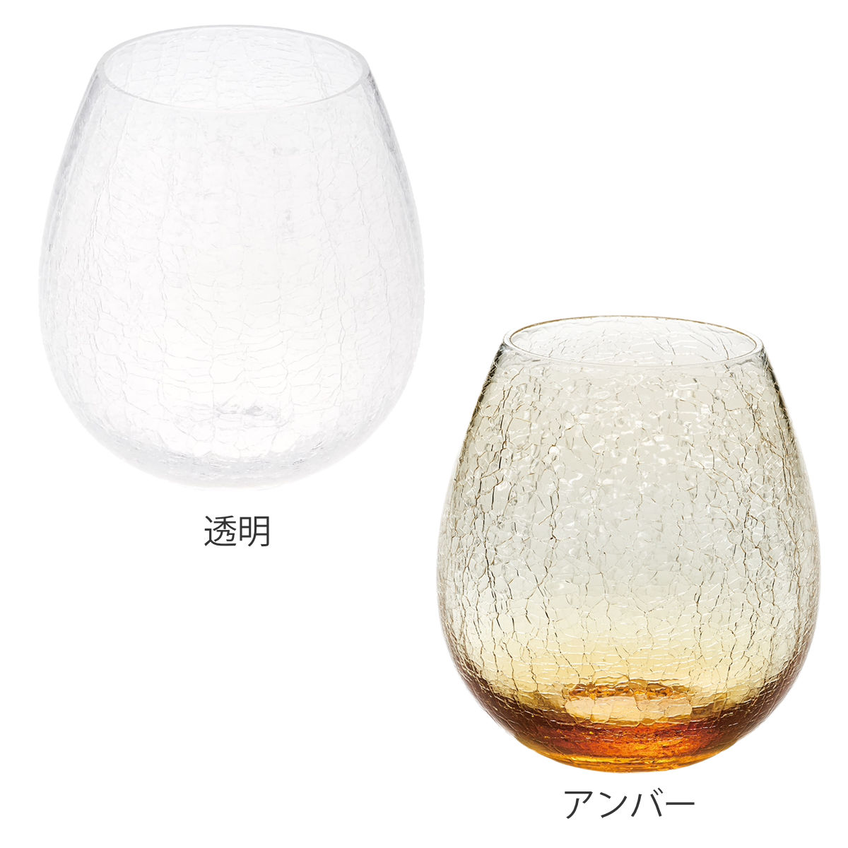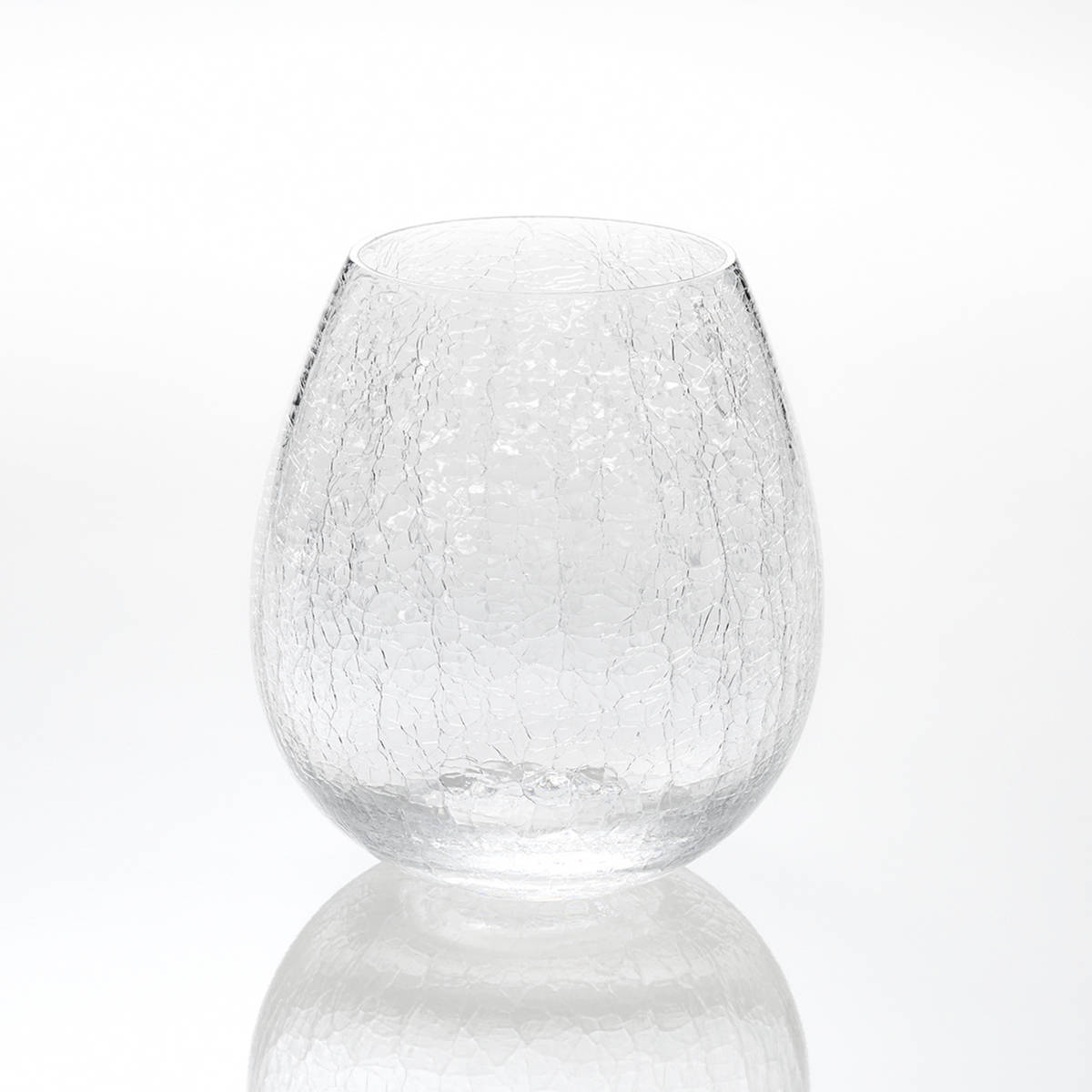 職人の手仕事が生む温かみと透明感が魅力のグラス。ワイングラスのように包み込む口元のすぼまった形が、飲み物の香りを引き立てます。陶磁器の釉薬の貫入のような、クラック模様が涼やかで、光の下で傾けるときらきらと輝きます。一口一口、手に取るごとに煌めいて、食卓やバーシーンに華やぎと落ち着きを添えてくれます。