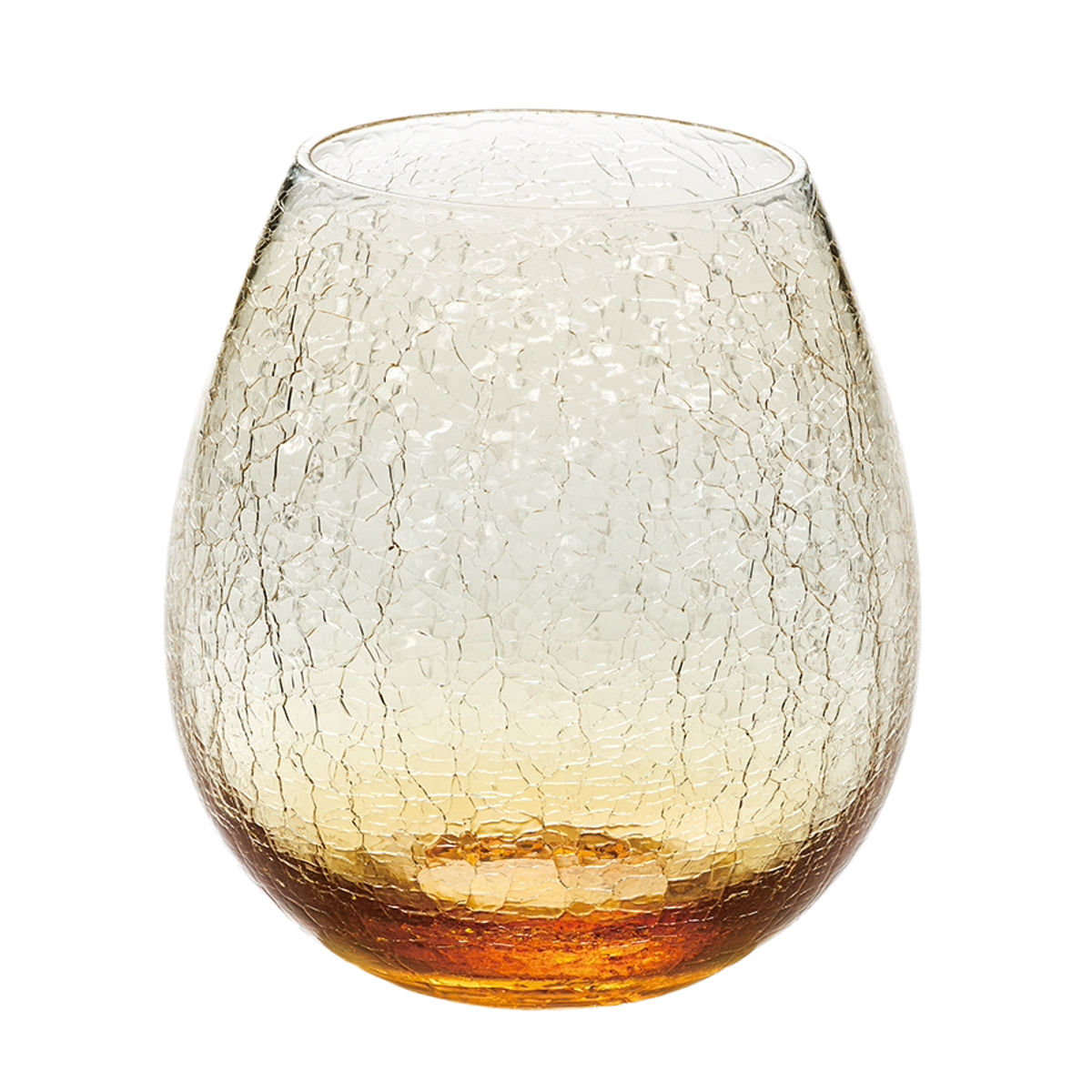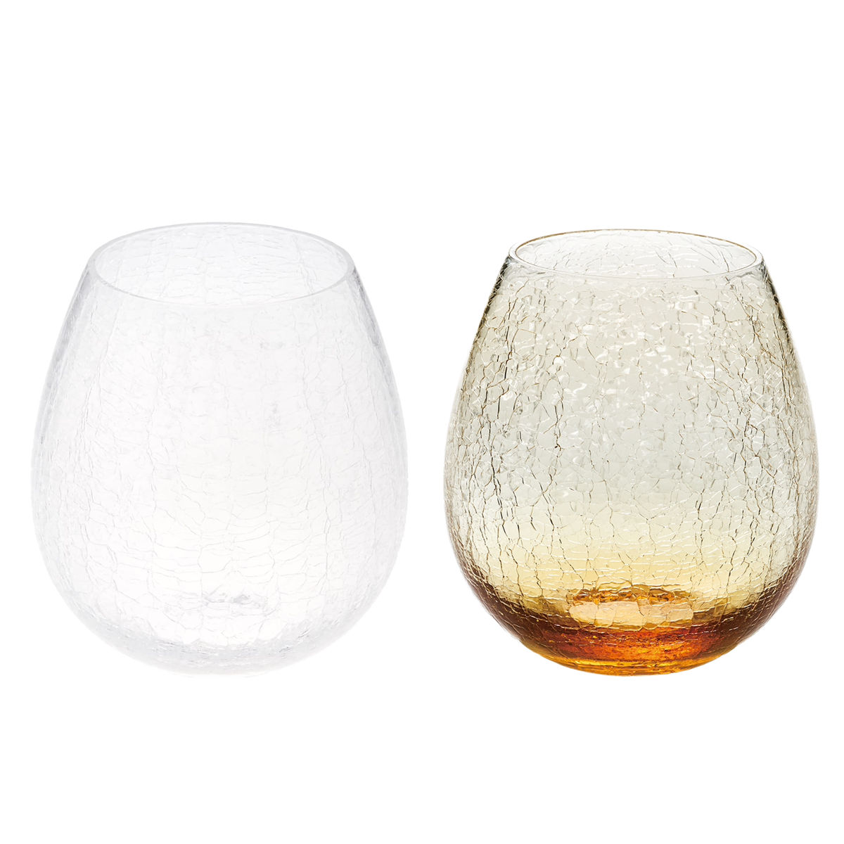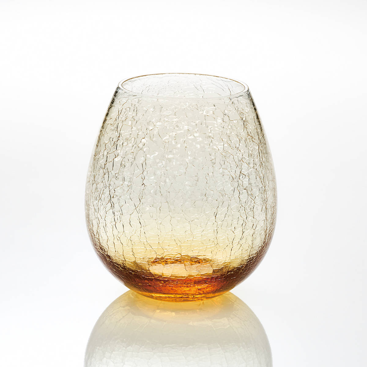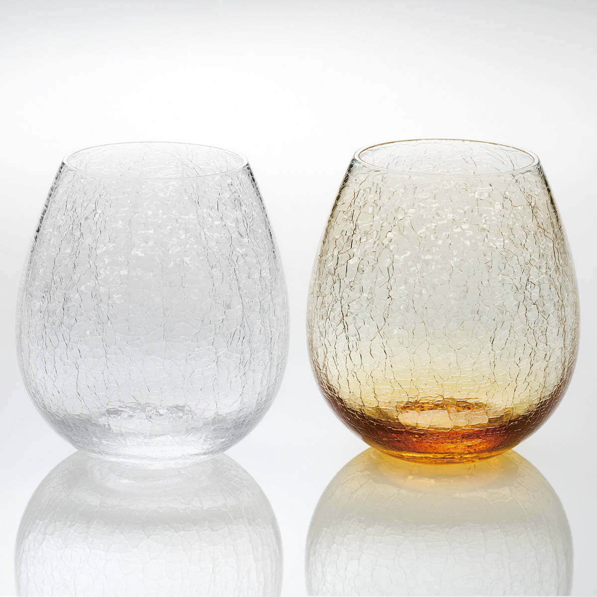 職人の手仕事が生む温かみと透明感が魅力のグラス。ワイングラスのように包み込む口元のすぼまった形が、飲み物の香りを引き立てます。陶磁器の釉薬の貫入のような、クラック模様が涼やかで、光の下で傾けるときらきらと輝きます。一口一口、手に取るごとに煌めいて、食卓やバーシーンに華やぎと落ち着きを添えてくれます。