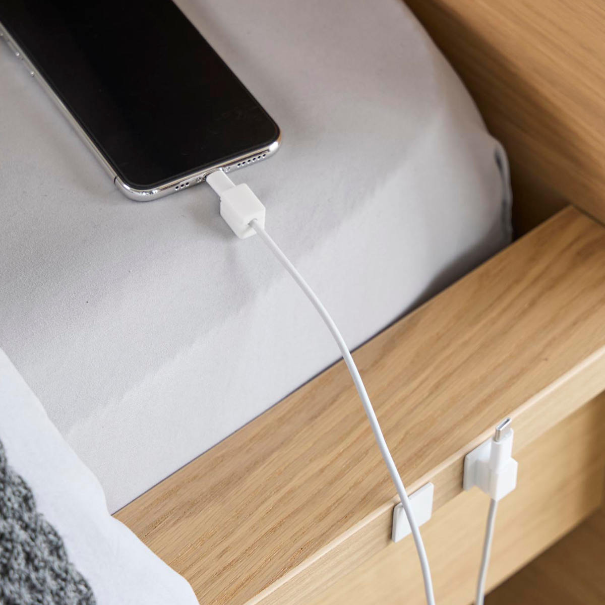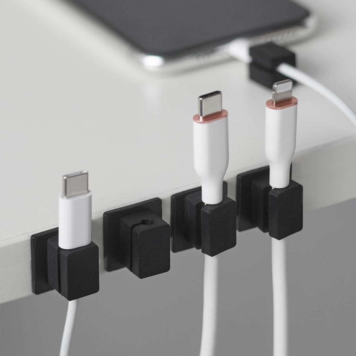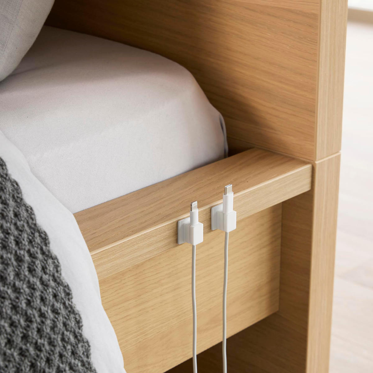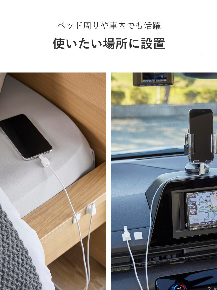 1個ずつ独立しているタイプなので、必要な数だけ取り付けられます。車内など狭いスペースにも対応でき、自由なレイアウトが可能です。ベッドサイドや車内でも、ケーブルが床に落ちず、配線がスッキリ片付きます。