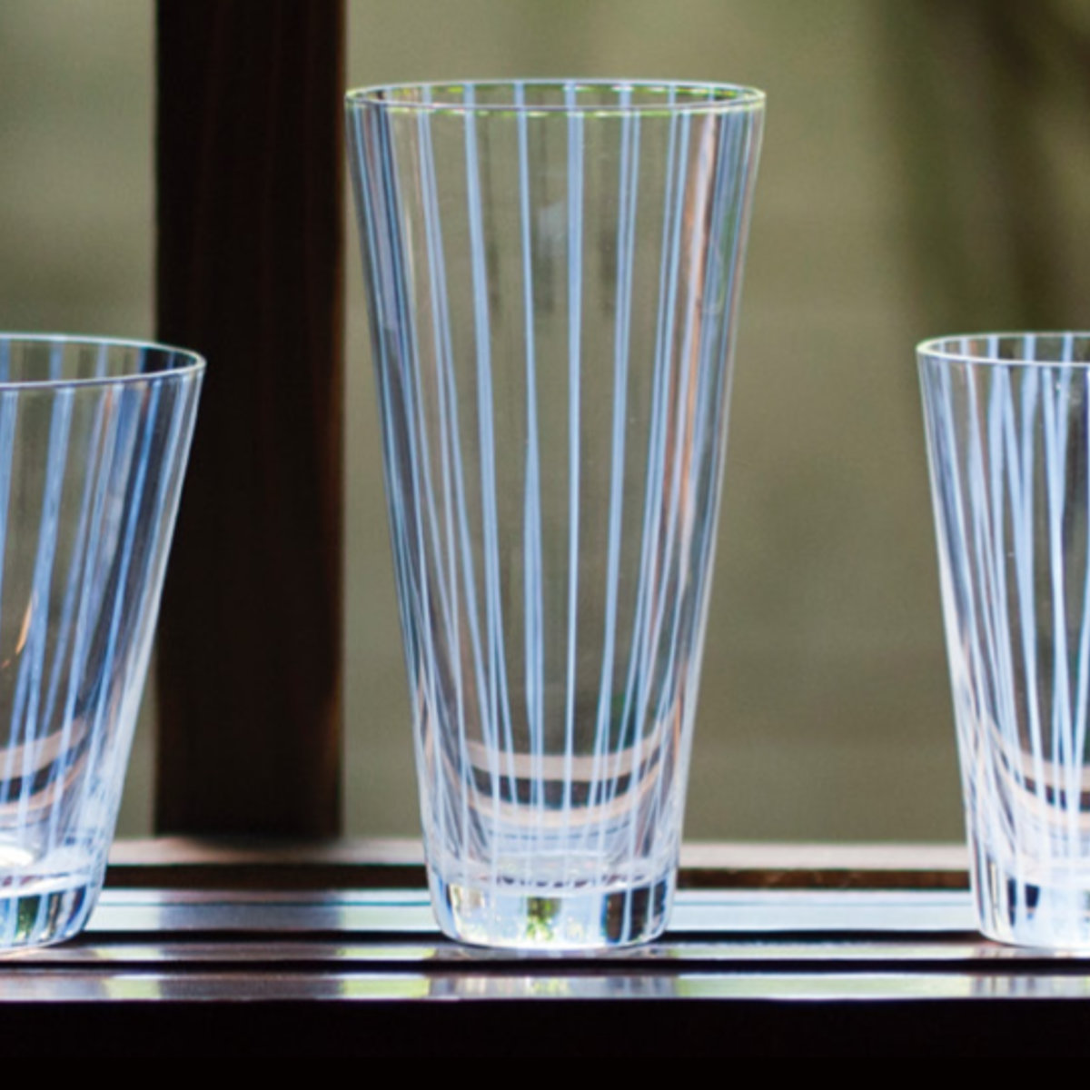 十草とは、日本全土に自生する山野草「木賊」をモチーフにした日本古来の紋様の総称です。織物や陶磁器などにも用いられ、縦縞様の柄は総じて十草紋様と呼ばれてきました。乳白あぶり出し技法で繊細なストライプの十草紋様を表現した、爽やかなグラスです。