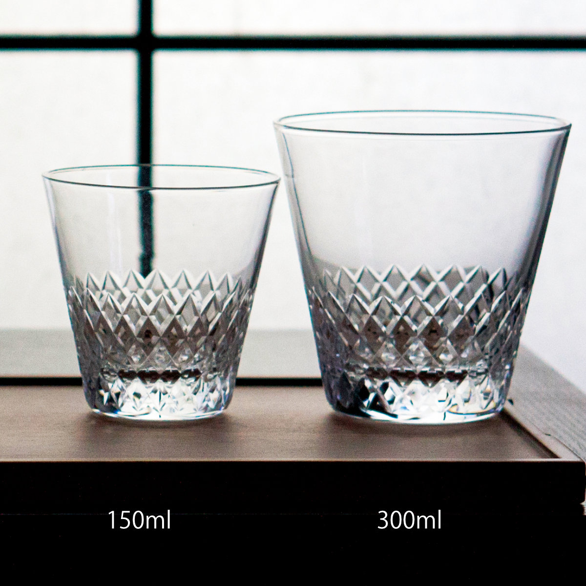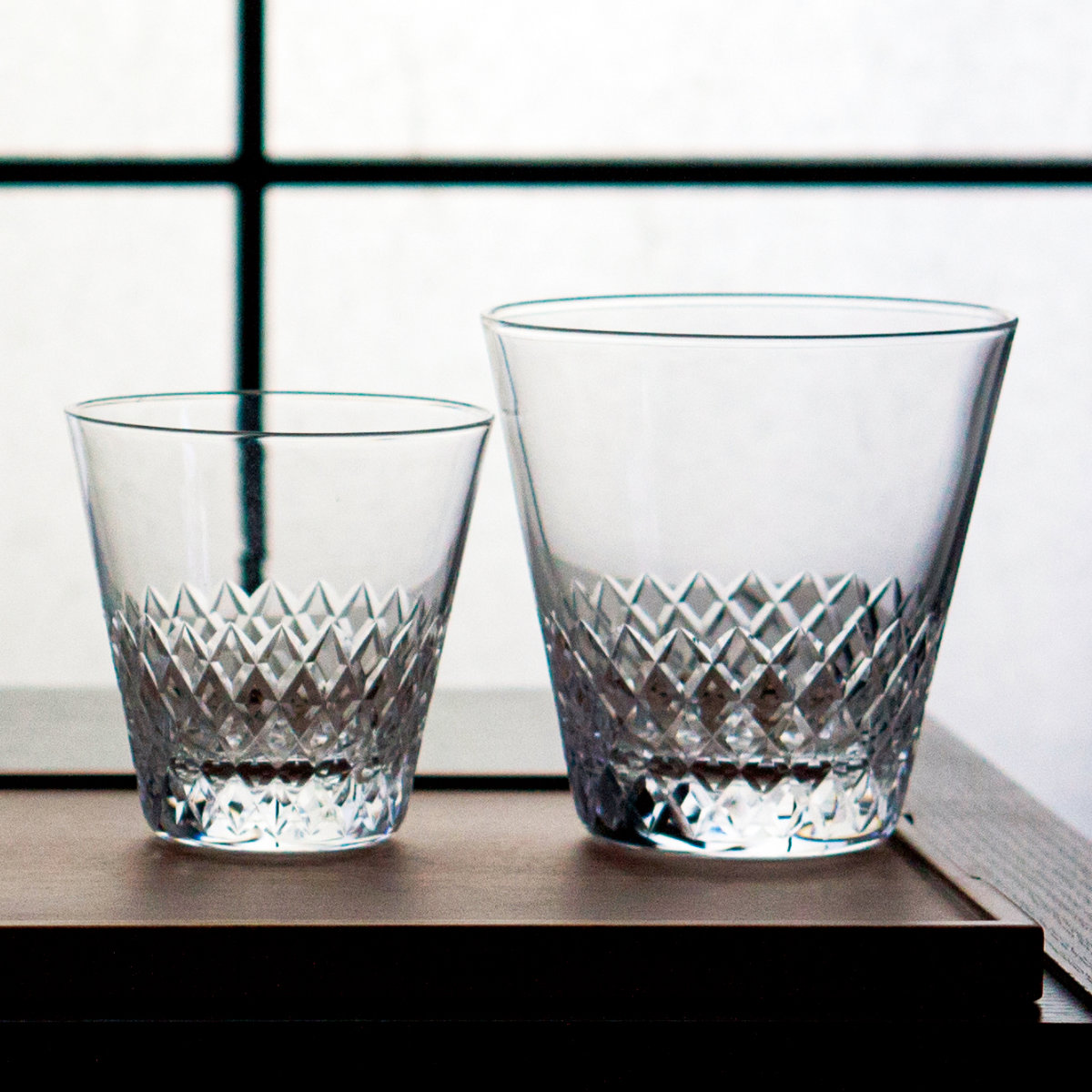 切子硝子の交差するカットの紋様を織物の「綾」に見立てたシリーズです。「綾模様」の繊細なカットが、光を受けて美しくきらめき、食卓やバータイムを華やかに演出します。