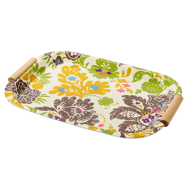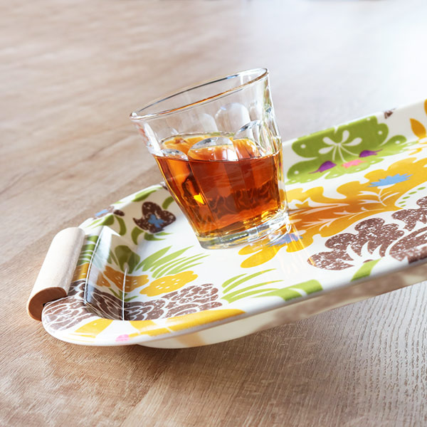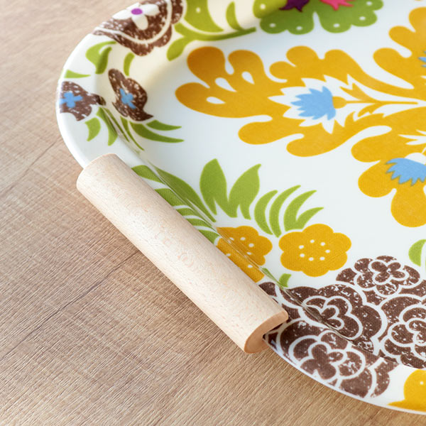 手持ち部分が木製で装飾してあり、重いものを乗せても持ちやすい仕様のトレーです。大判サイズなので、パーティやアウトドアのおもてなしにと、様々なシーンで活躍します。森をモチーフにしたデザインがお部屋を明るく彩ります。