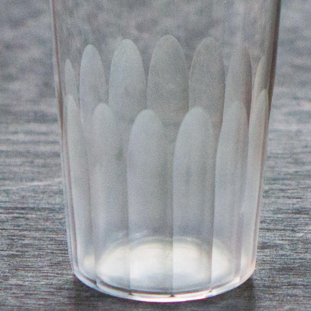 薄手のガラスに施された高い技術によるカット模様。柄は蒲鉾をイメージした独特なデザインで、職人技が光ります。