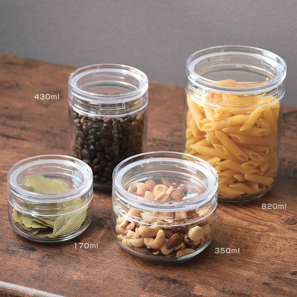 透明なフタで収納時も上から中身が見えるキャニスターです。食材や調味料をひと目で確認でき、使い勝手抜群です。本体はガラス製なのでにおい移りや色移りが少なく、長く清潔に使えます。