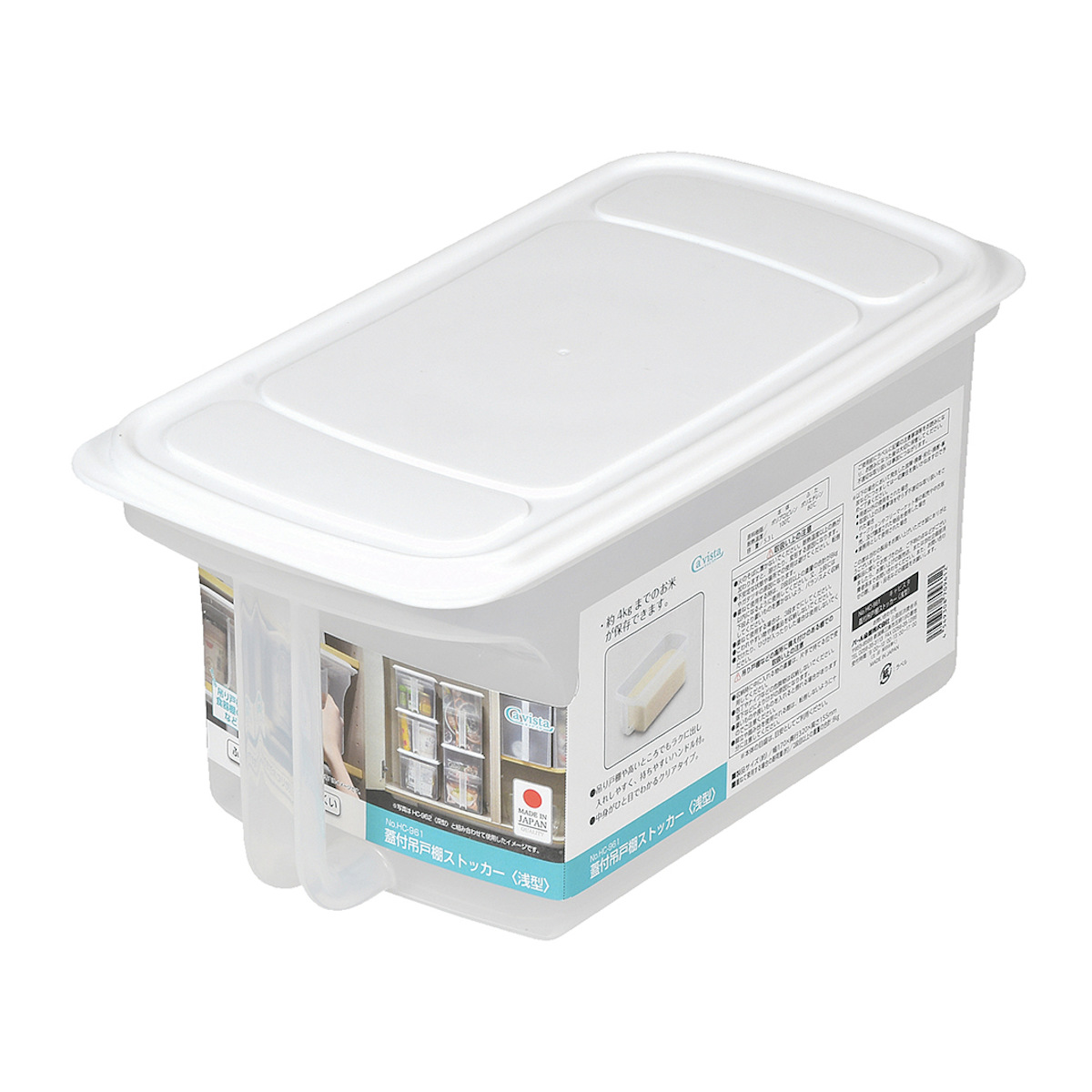 キッチン収納の空間を無駄なく使える、フタ付きの吊り戸棚ストッカーです。普段使いしないものやストックを置いておくための、高い場所の収納に便利にお使いいただけます。約4kgまでのお米を保存することもできます。