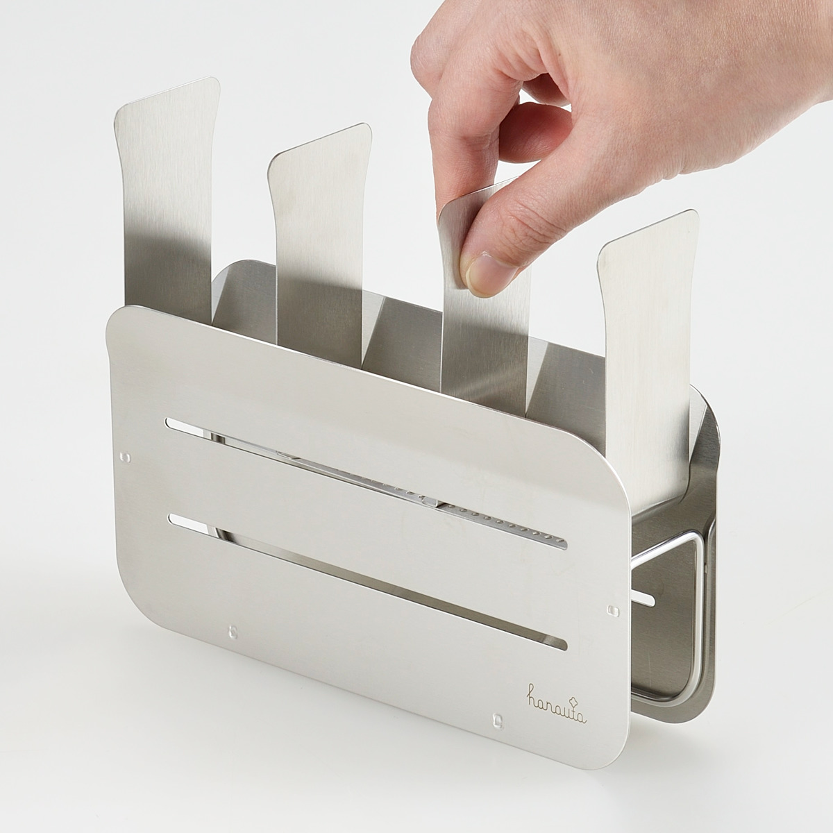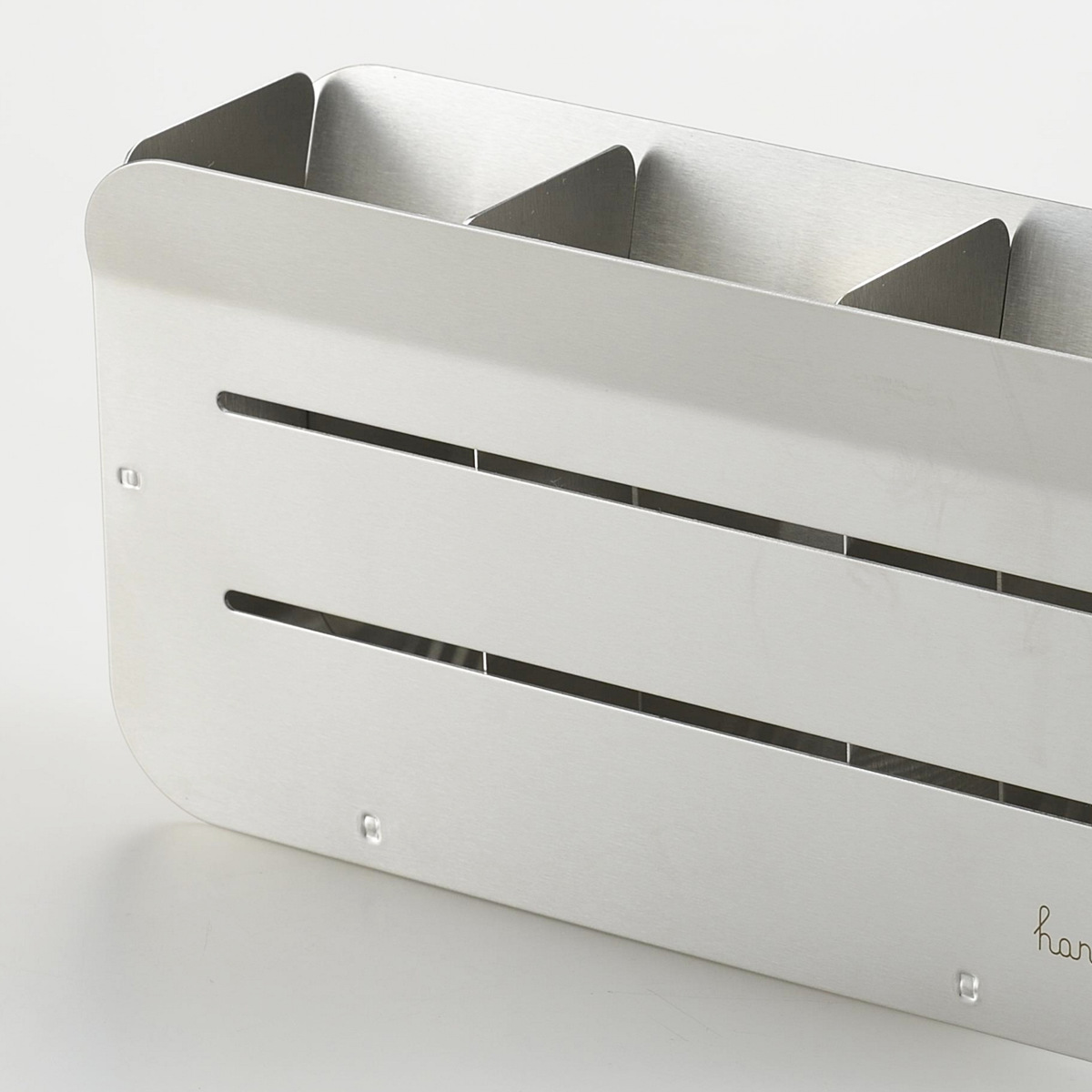 hanautaシリーズの水切りラックに取り付けて使えるカトラリーポケットです。熟練の技で磨き上げられた上質なデザインが、暮らしに凛とした彩りを添え、毎日の水切りを心地よく演出します。