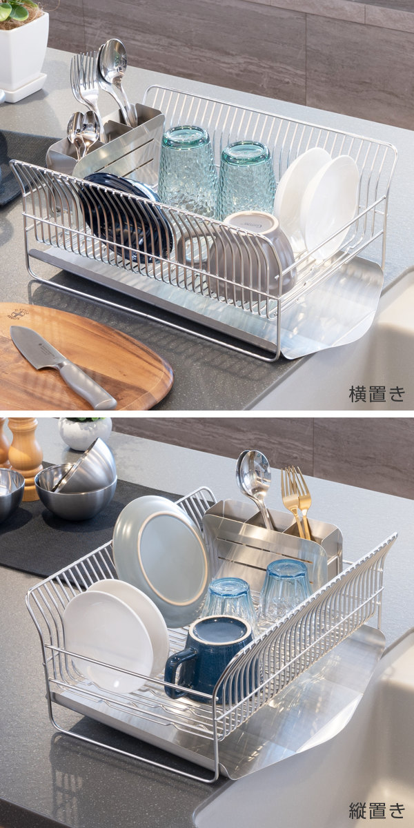 水切りラックに引っ掛けるだけのシンプルな構造。横置きにも縦置きにも対応しているので、お手持ちの水切りラックにもスッと取り付けられます。