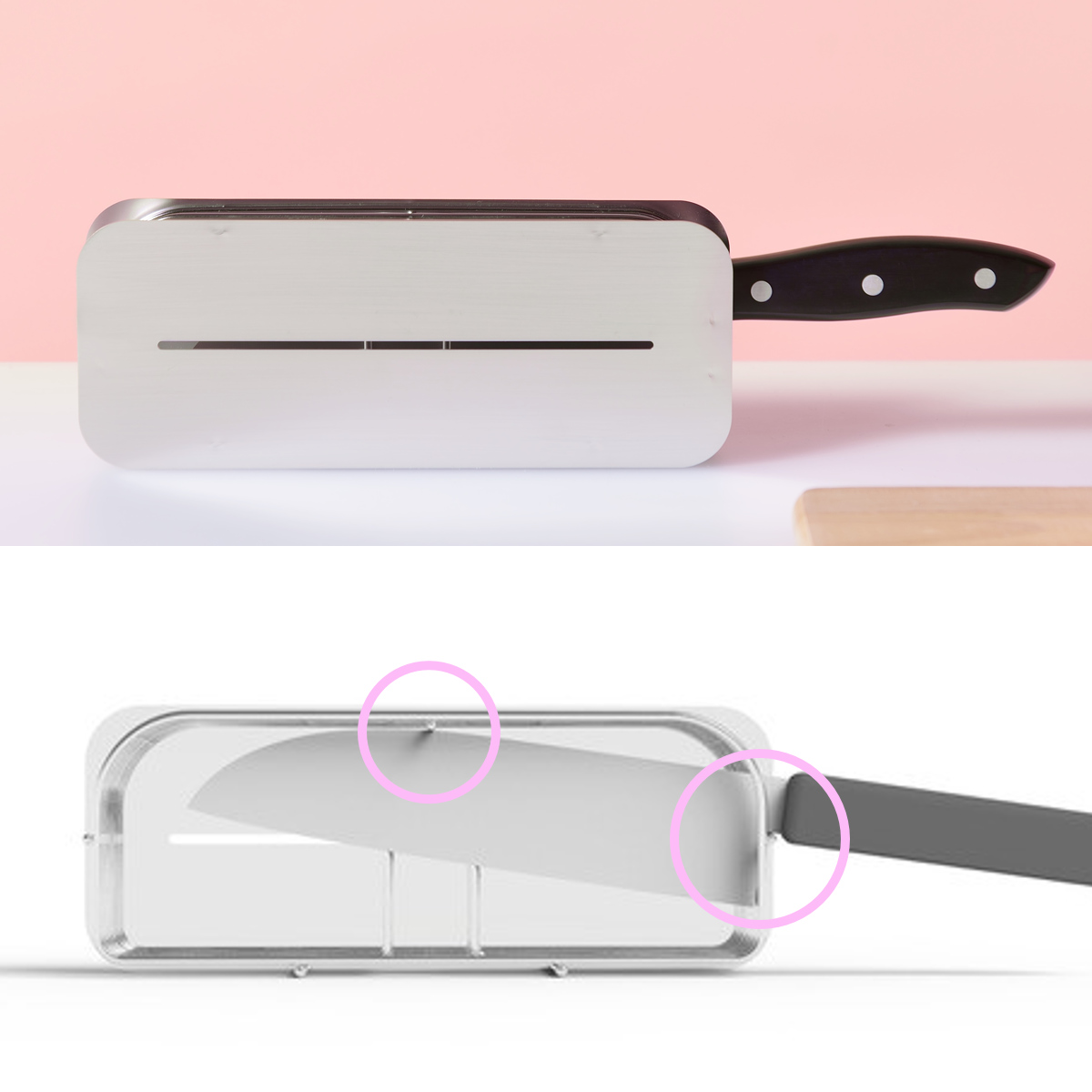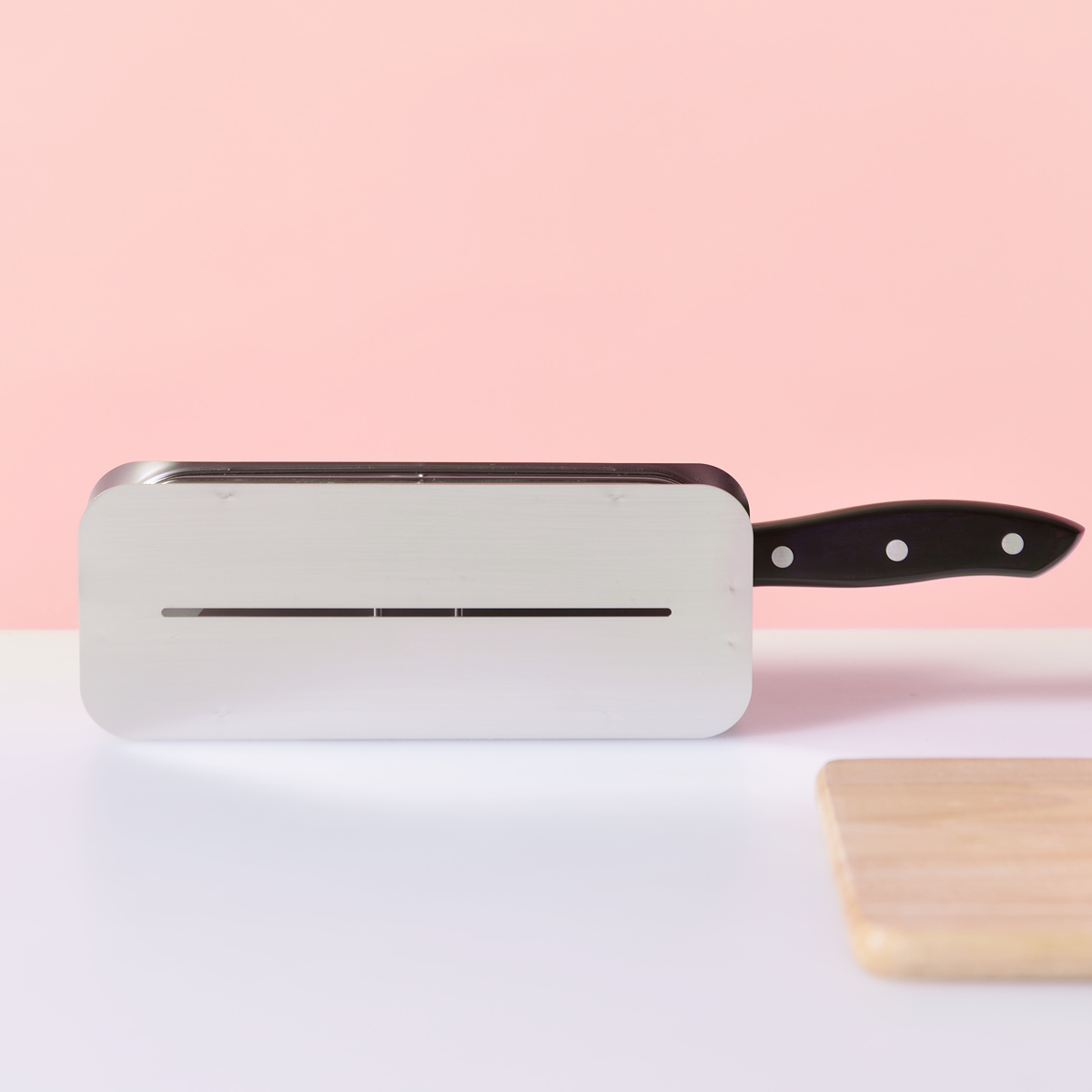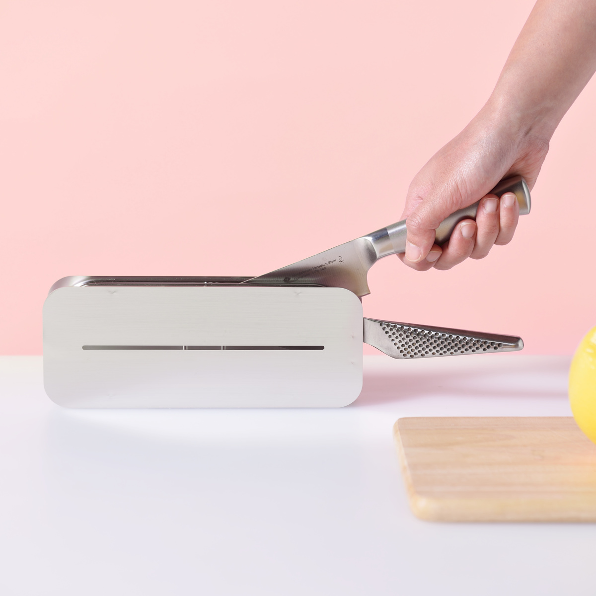 奥行わずか5cmのコンパクト設計で、ちょっとしたスペースにもすっきり置けます。包丁は両サイドから差し込めるので使い勝手も抜群。刃の部分はステンレスプレートで隠れるため、見た目もスマートで上質な印象です。