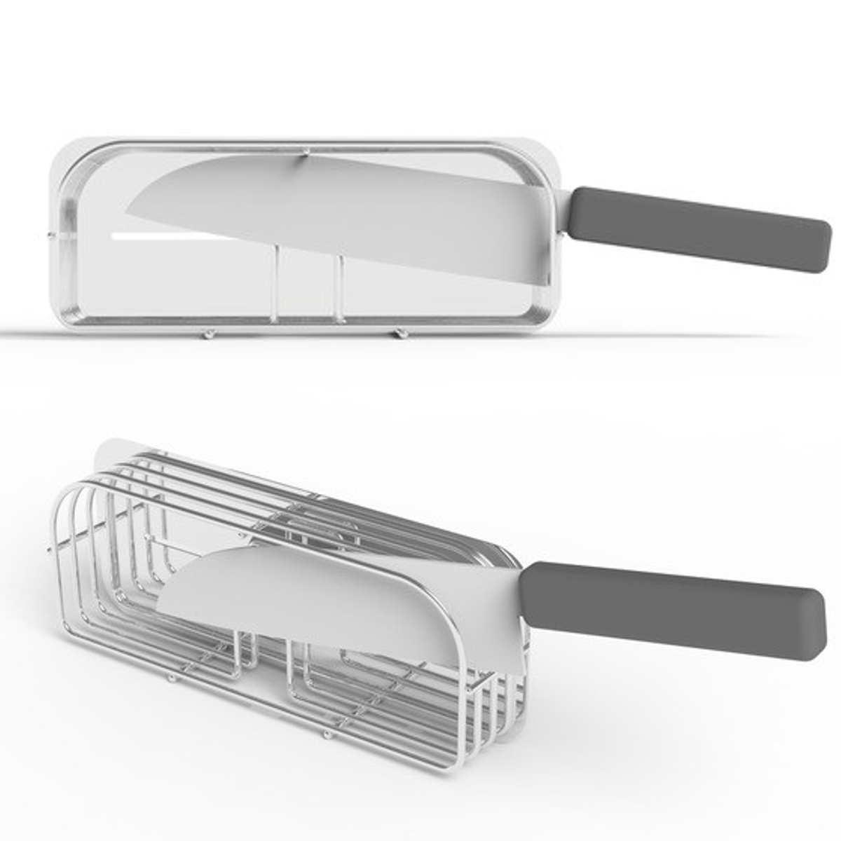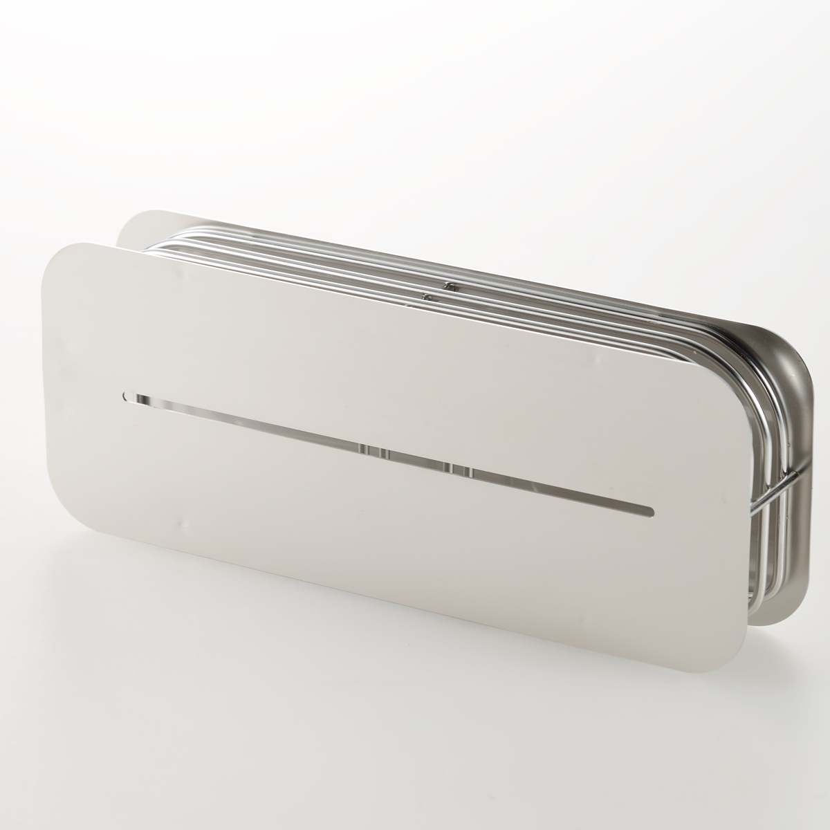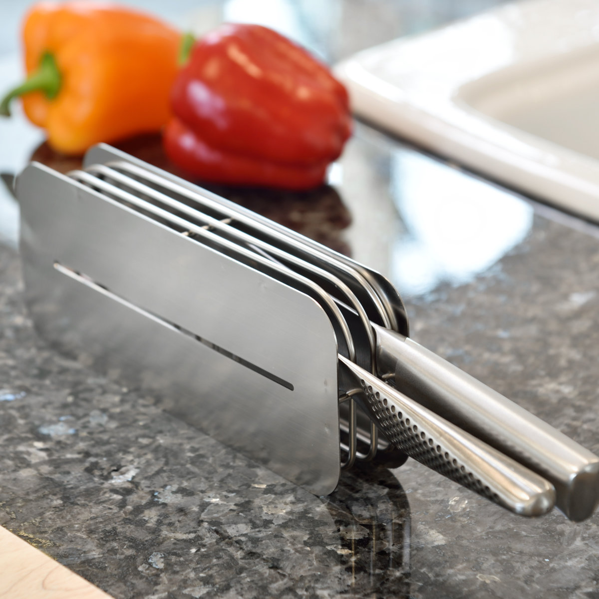 奥行わずか5cmのコンパクト設計で、ちょっとしたスペースにもすっきり置けます。包丁は両サイドから差し込めるので使い勝手も抜群。刃の部分はステンレスプレートで隠れるため、見た目もスマートで上質な印象です。