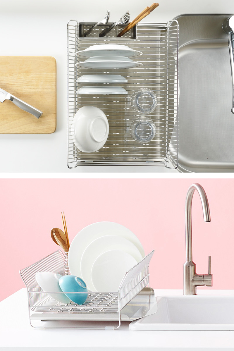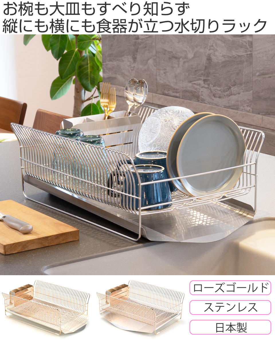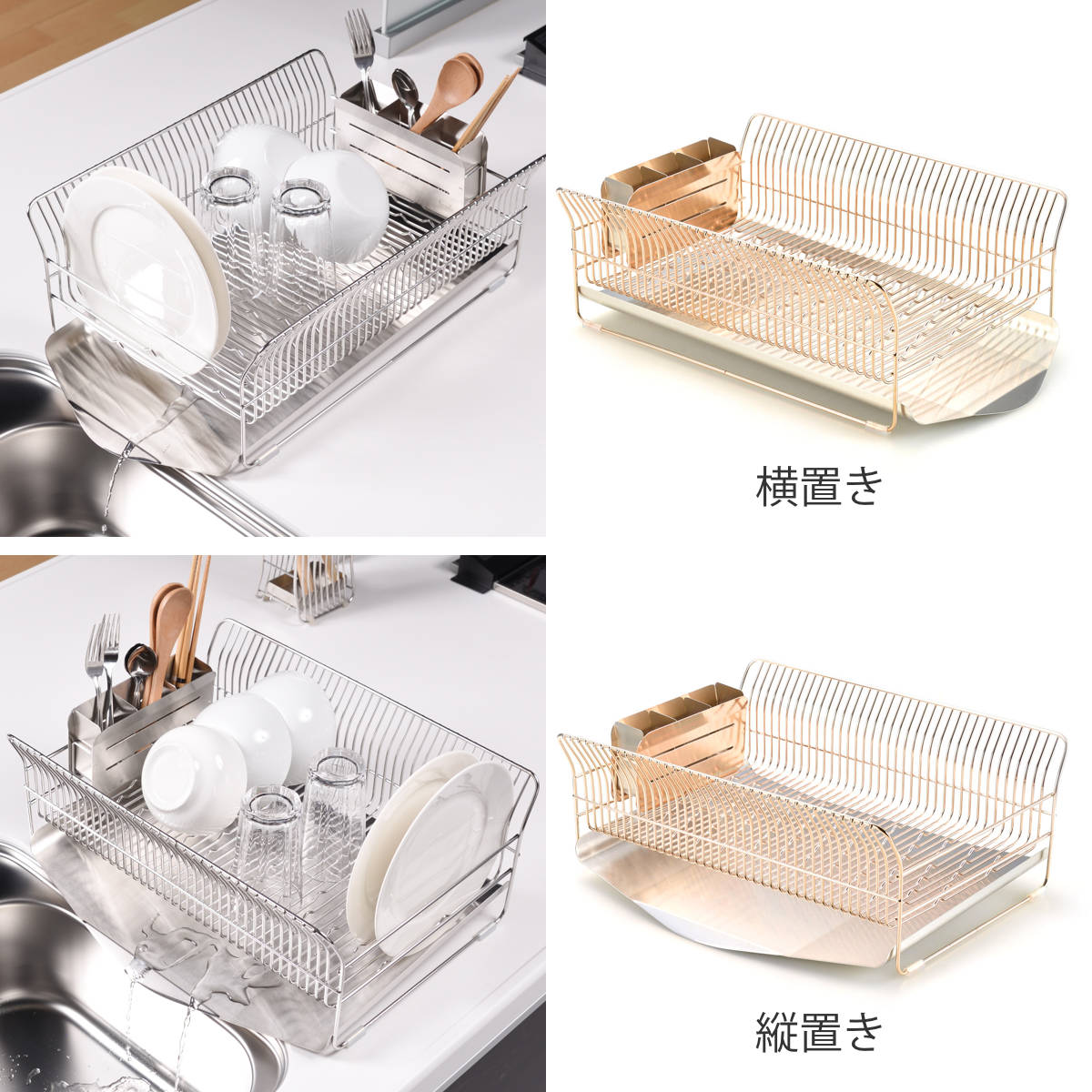 耐荷重は約10kg。縦横どちらにも効率よく食器を置けるので、大皿やお椀、重たいフライパンやまな板も水切りできます。