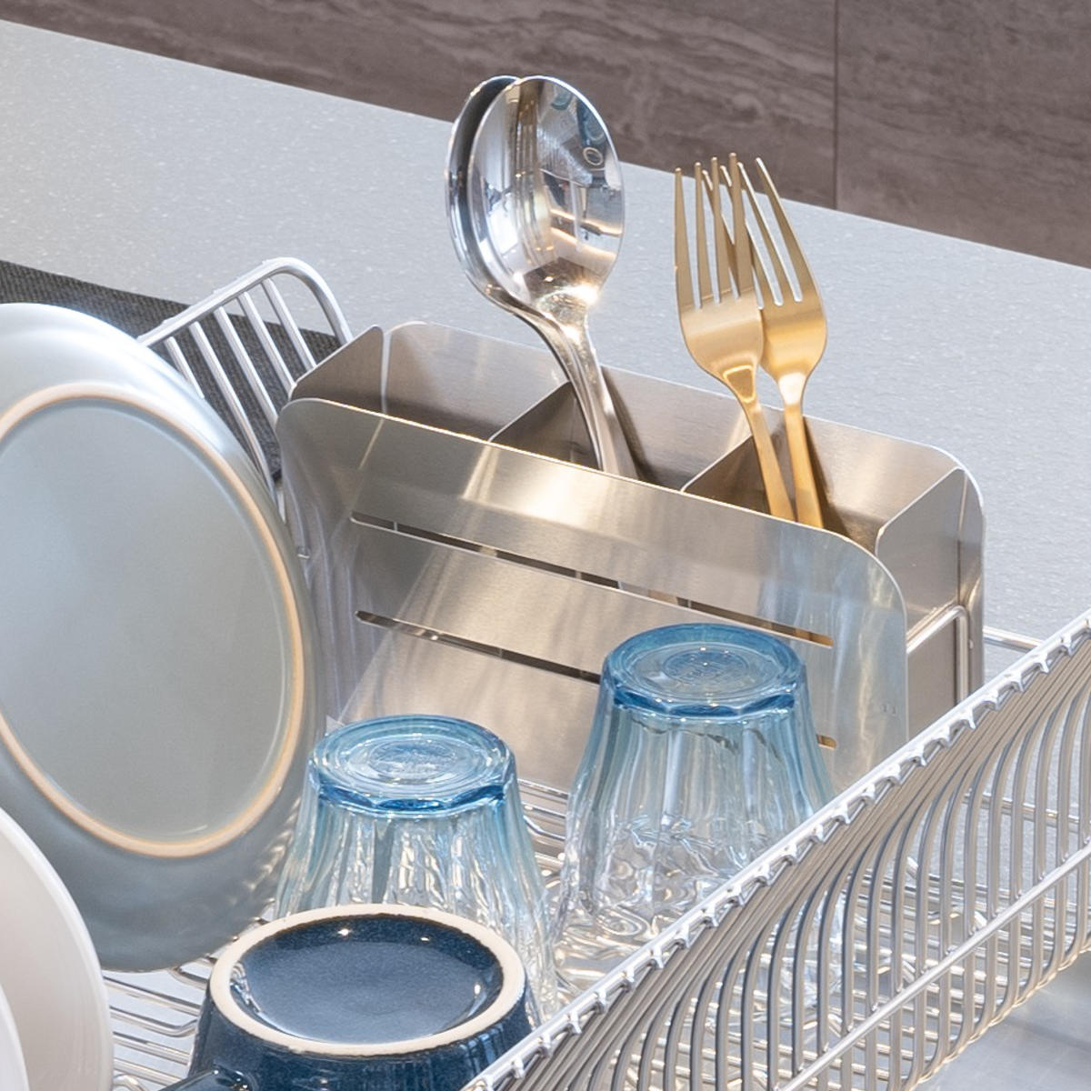 カトラリーポケットは単独でも使用でき、設置面を傷つけないシリコーンゴム付き。水切りしたカトラリーをそのまま収納棚や食卓に運べ、毎日の食事準備をスマートにサポートします。
