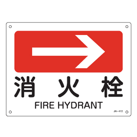 ●矢印と日本語・英語の2カ国語で、消火栓の位置を示します。