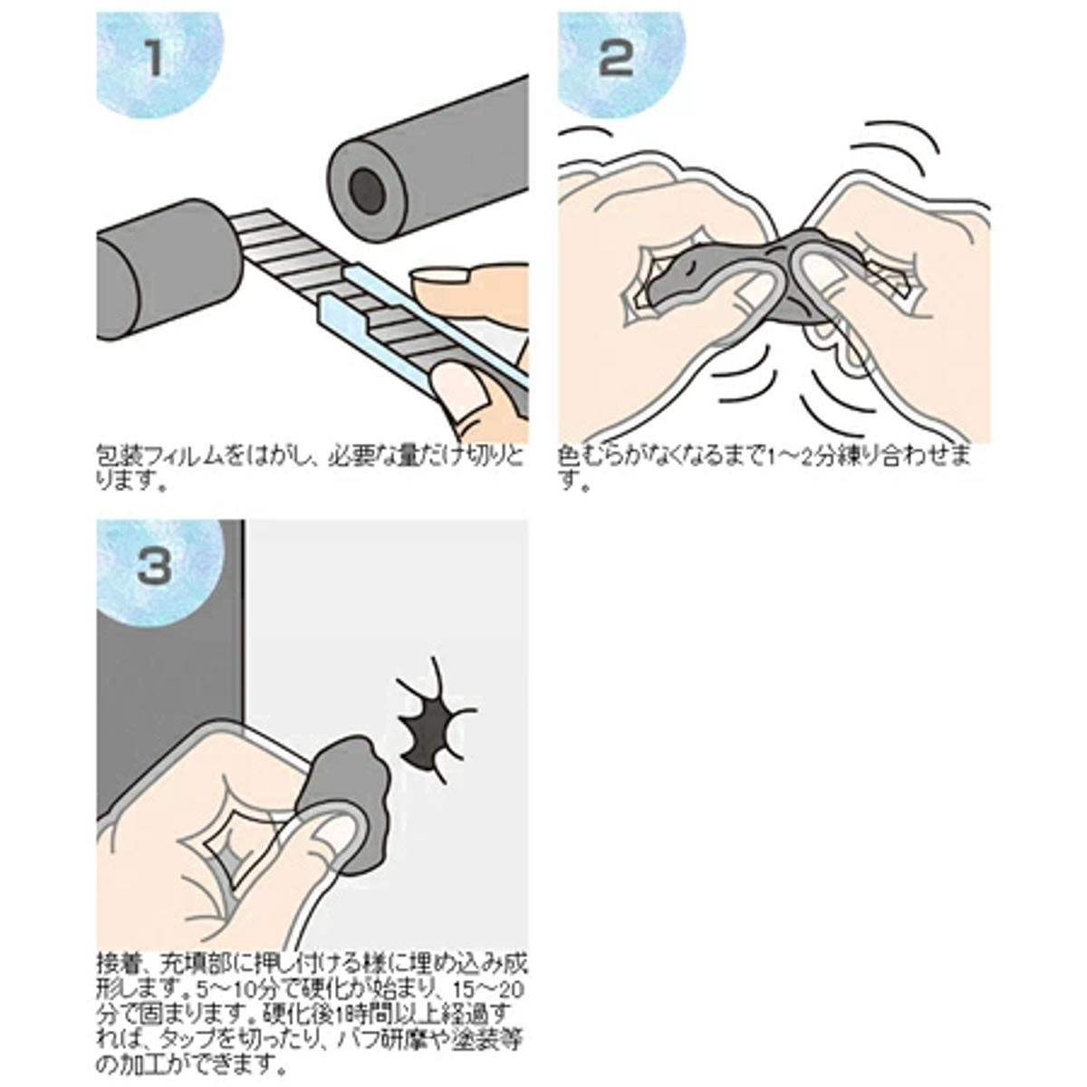 ●切って練り合わせるだけの使いやすい粘土状パテです。