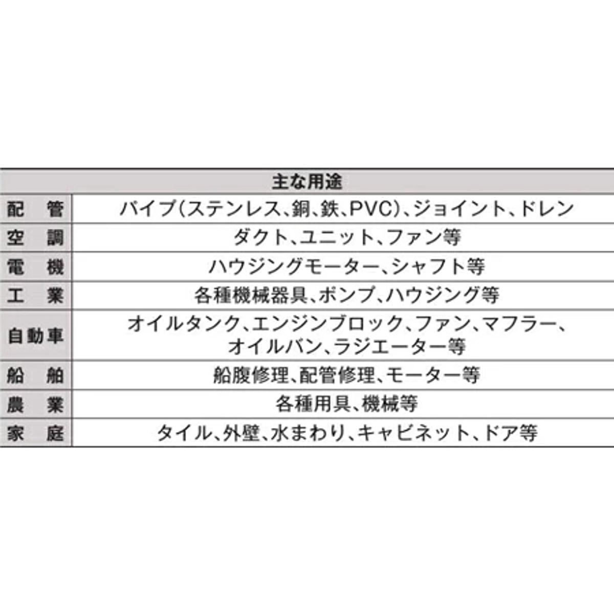 ●接着、シール、モールド等の穴やひび割れの補修、表面再形成など、さまざまな用途でお使いいただけます。