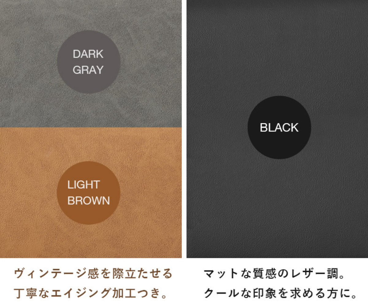 ヴィンテージ感を際立たせる丁寧なエイジング加工がされたダークグレーとライトブラウン。マットな質感のレザー調のブラック。どのカラーも本物のような質感を味わえます。