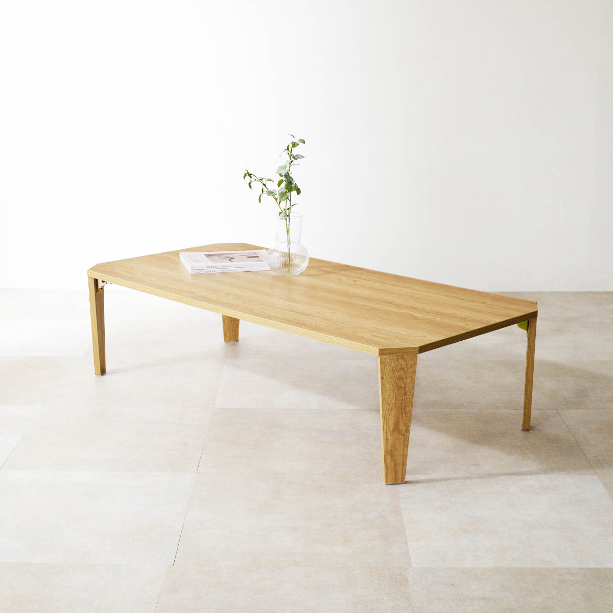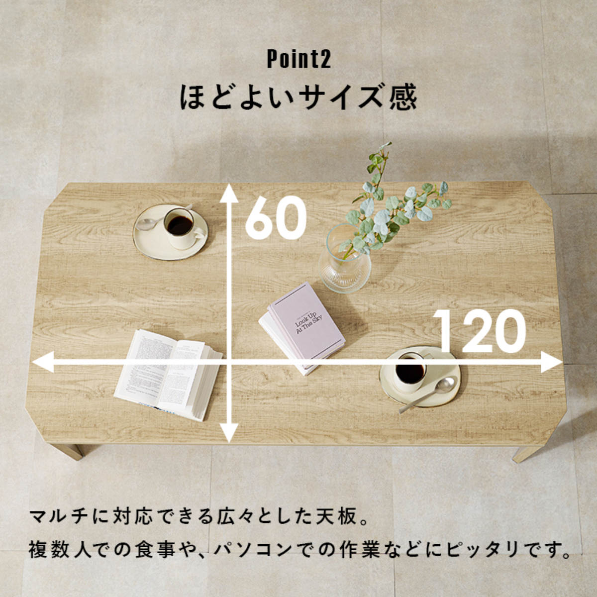 幅120cm、奥行60cmのゆったりとした天板なので、作業用デスクや食事用の座卓、来客時のサブテーブルにも活躍します。ライフスタイルに合わせて、自由に使える万能テーブルです。