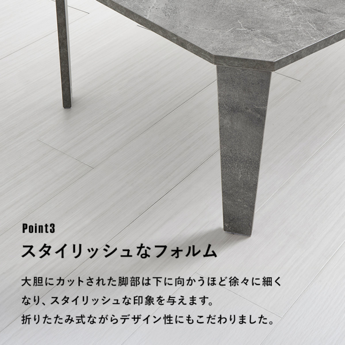 大胆にカットされた脚は、下に向かうほど徐々に細くなり、すっきりとした印象を演出。折りたたみ式ながら、デザイン性にもこだわりました。