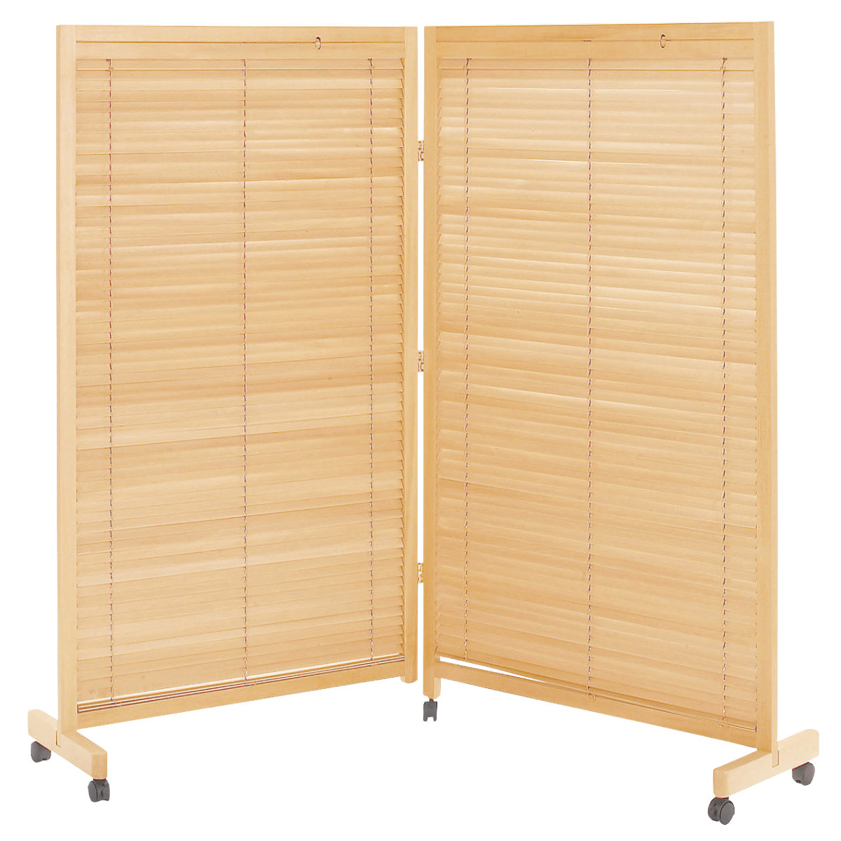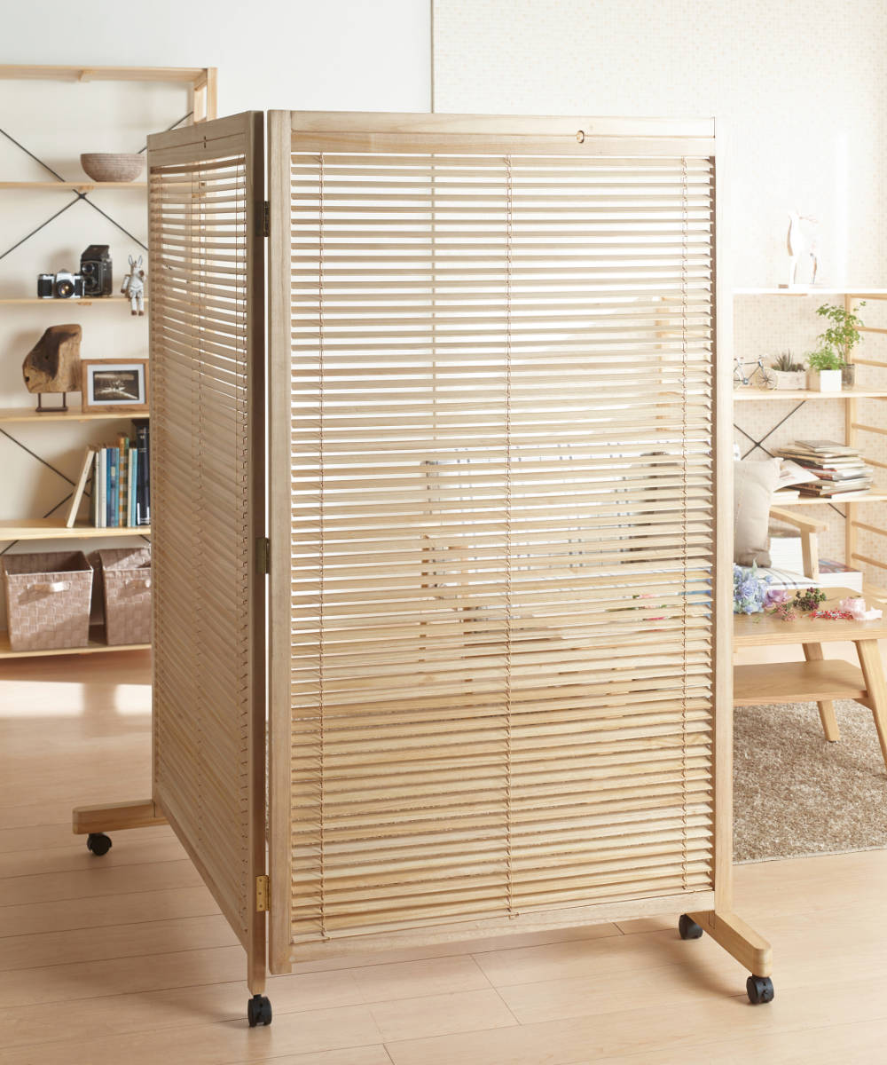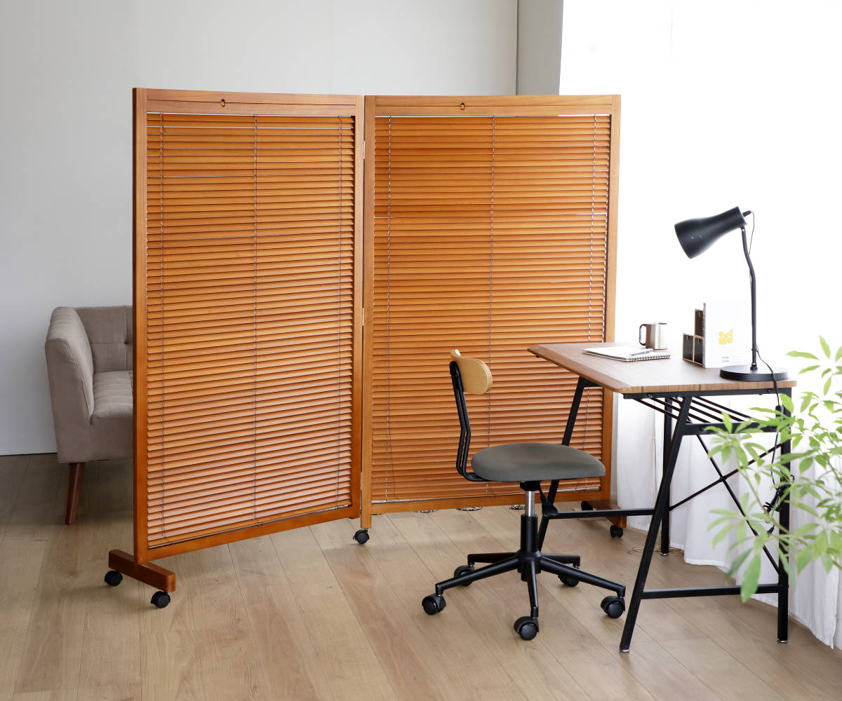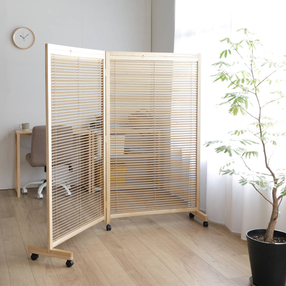 天然木のあたたかい風合いを活かした、高さ155cmの2連衝立です。間仕切りとしての機能性はもちろん、暮らしにやさしいアクセントを加えるデザインです。