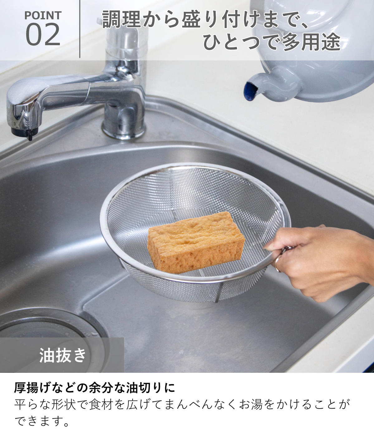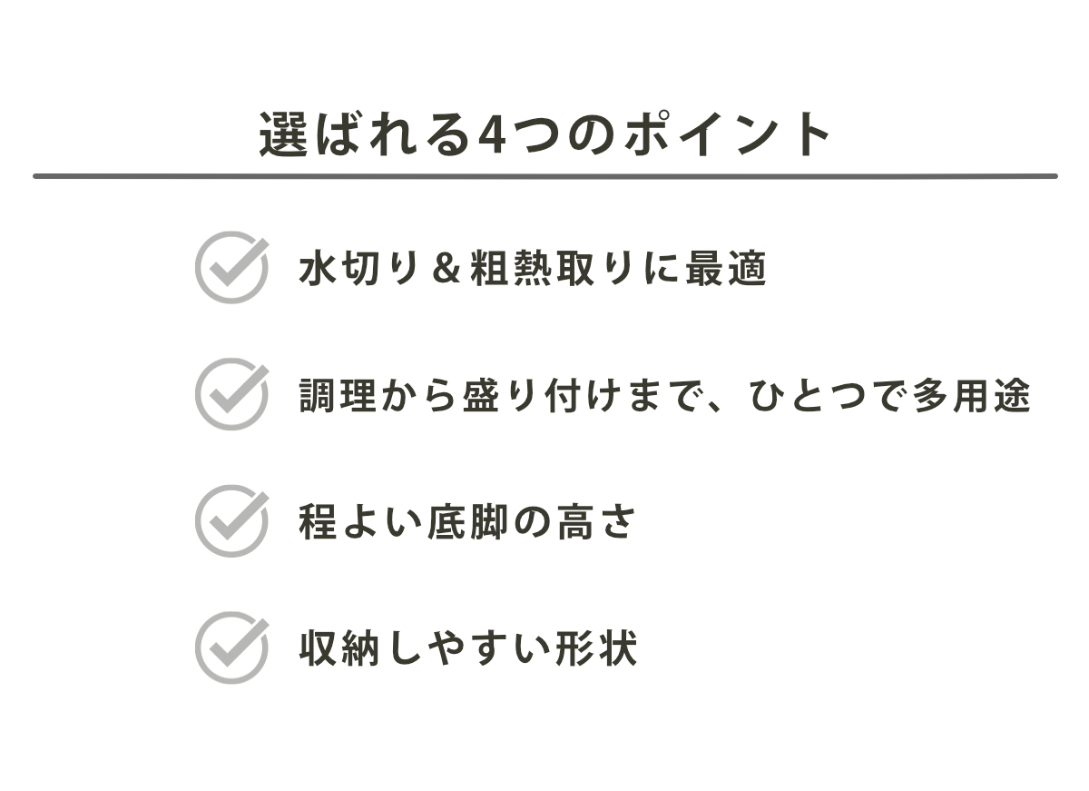 底面が平らな形状で食材を平たく並べることができるので、効率的に水切りできます。蒸気もこもりにくく粗熱取りにも最適です。