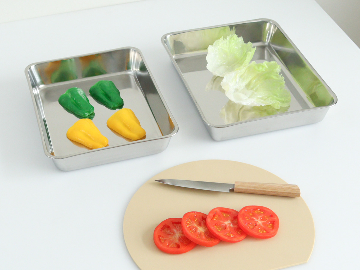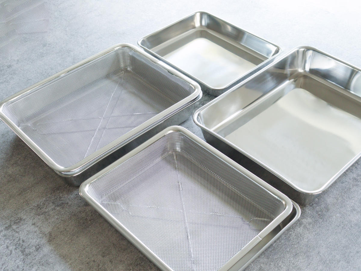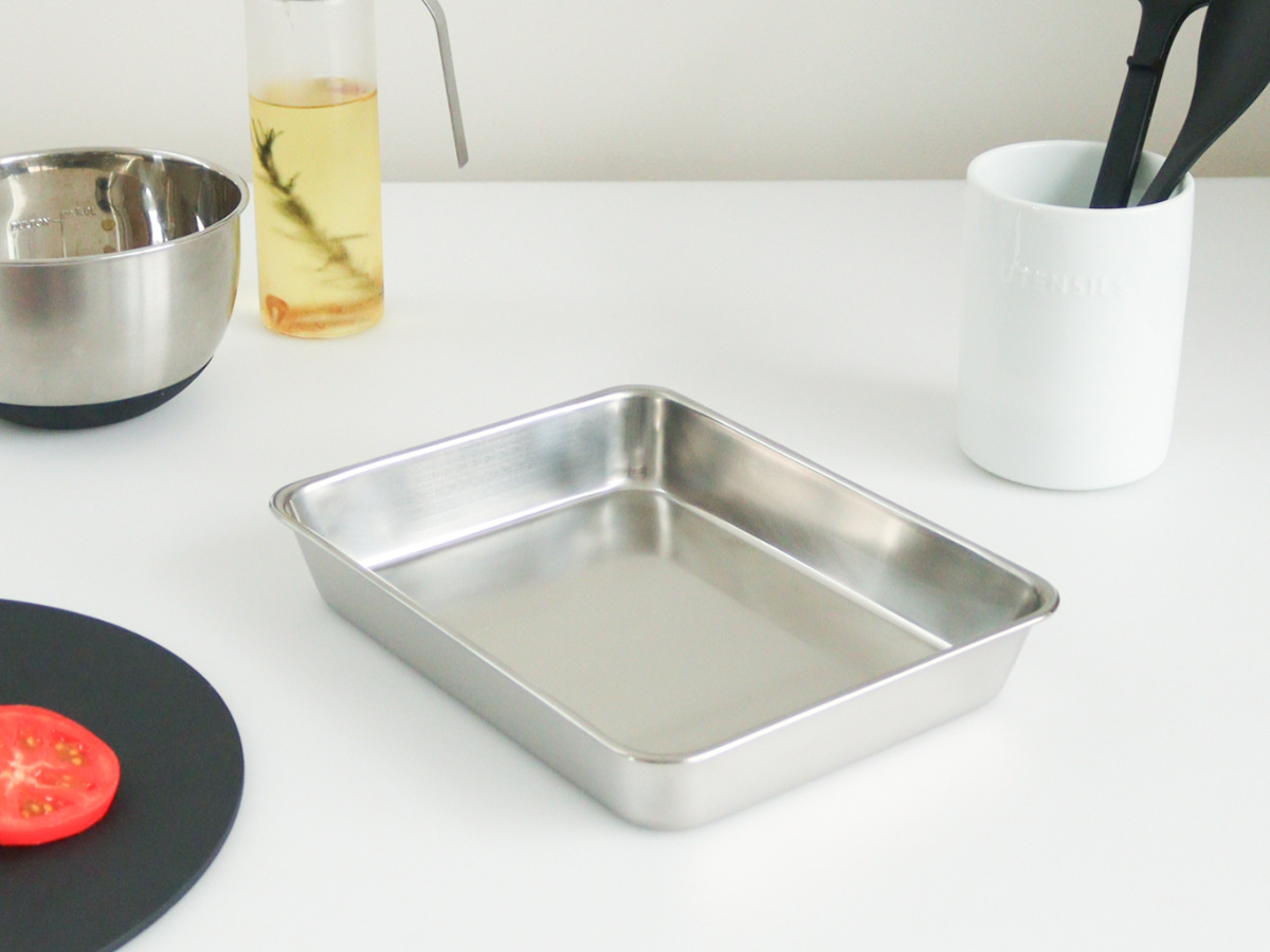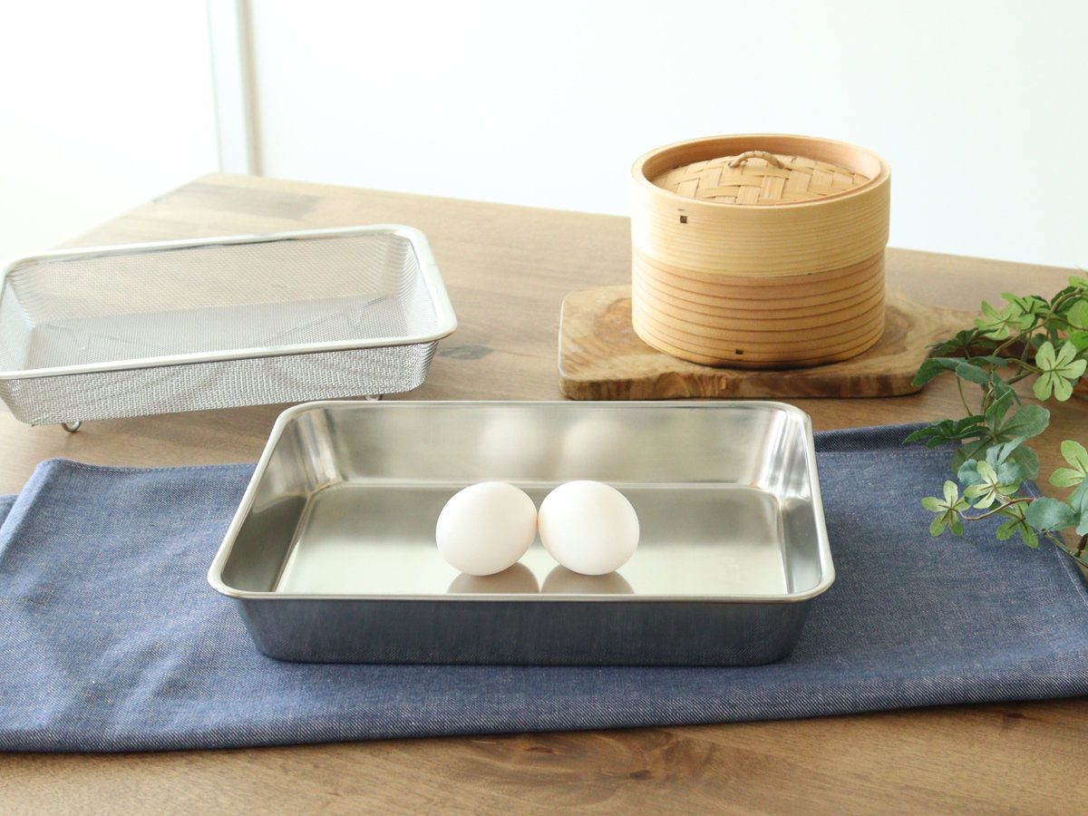 丈夫で美しいステンレス製調理器具を手がける、工房アイザワの【角バット 18枚取(幅26.7cm)】です。ステンレスは耐久性に優れており、衝撃や変形に強い素材です。長く使っても錆びにくく、美しさを保ちます。
