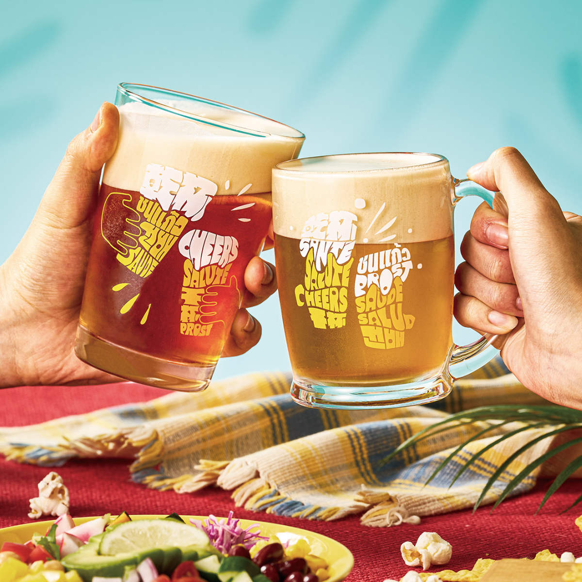 ●「乾杯」デザインのビールグラスは世界各国の挨拶がプリントされています。