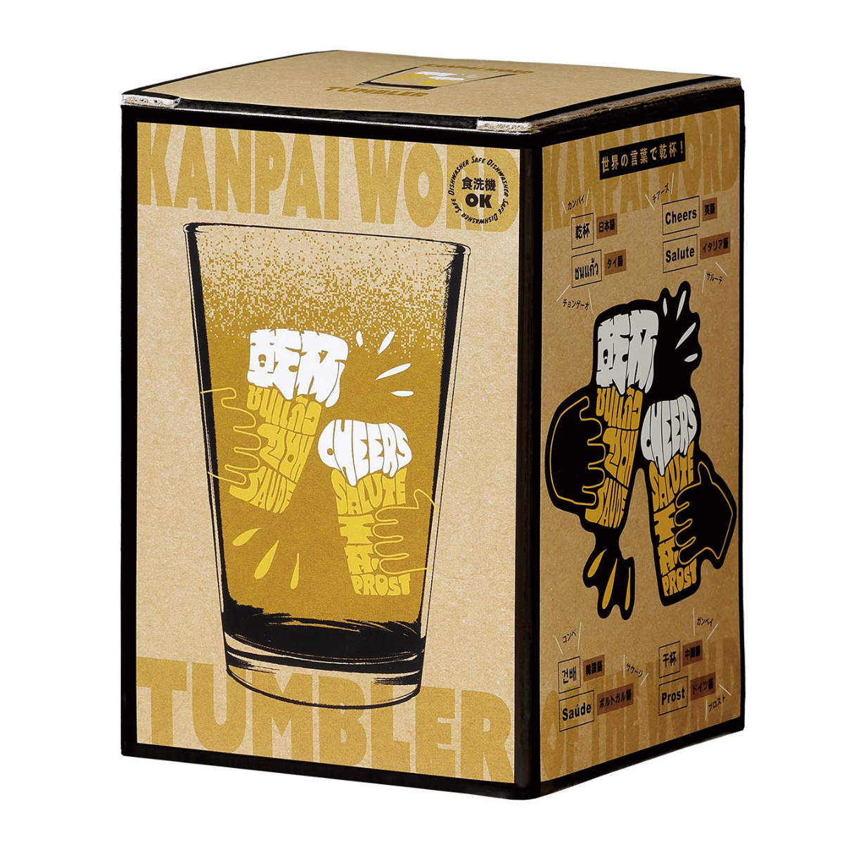 英語、中国語、フランス語など世界各国の「乾杯」がプリントされたビールにピッタリなグラスです。丈夫で透明感のあるソーダライムガラス素材を使用しています。