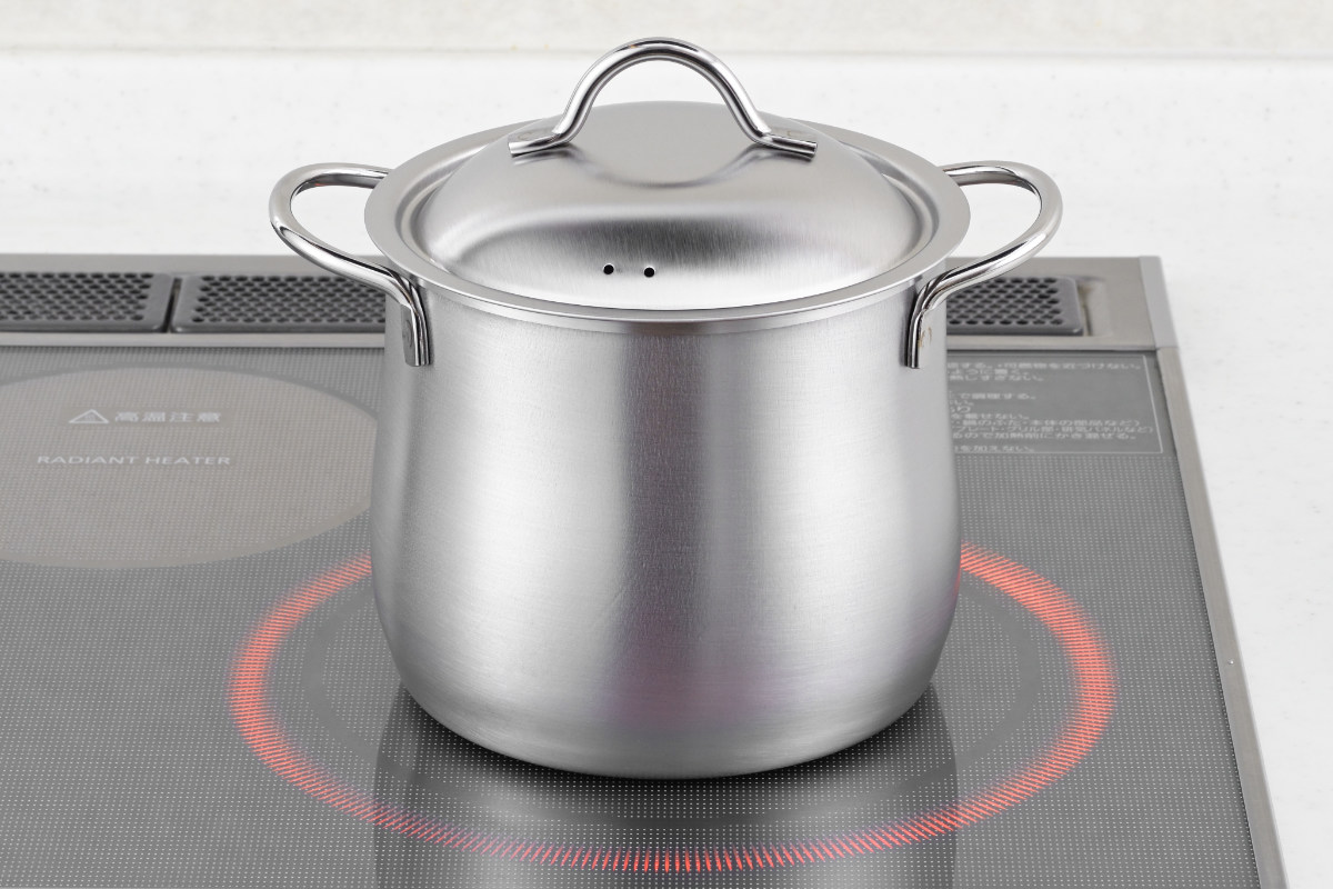コロンとした形が可愛い煮込み鍋は、深さがあるのでパスタを茹でるのにも便利です。ステンレス製なので、保温力が高く、コトコト弱火でじっくり煮込むポトフやシチューといった料理にピッタリです。直火・IHに対応しています。