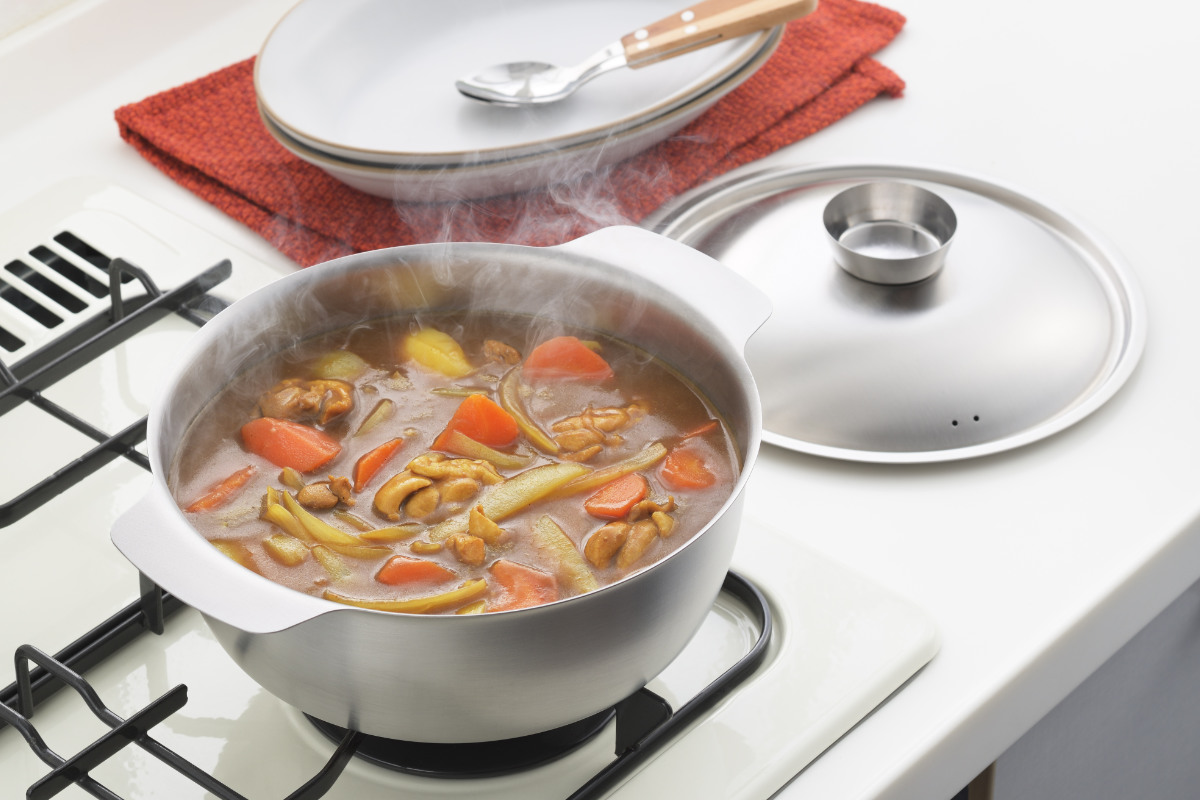 オールステンレス製の鍋は、大変丈夫でサビにくく、ニオイや色もつきにくいので、カレー鍋やキムチ鍋にもぴったりです。
