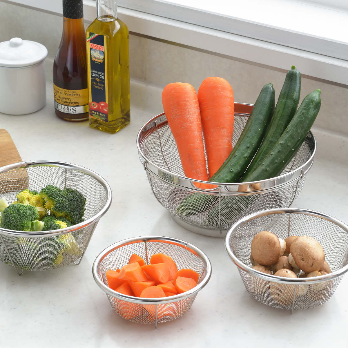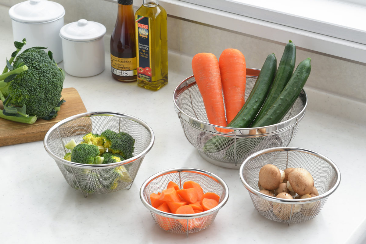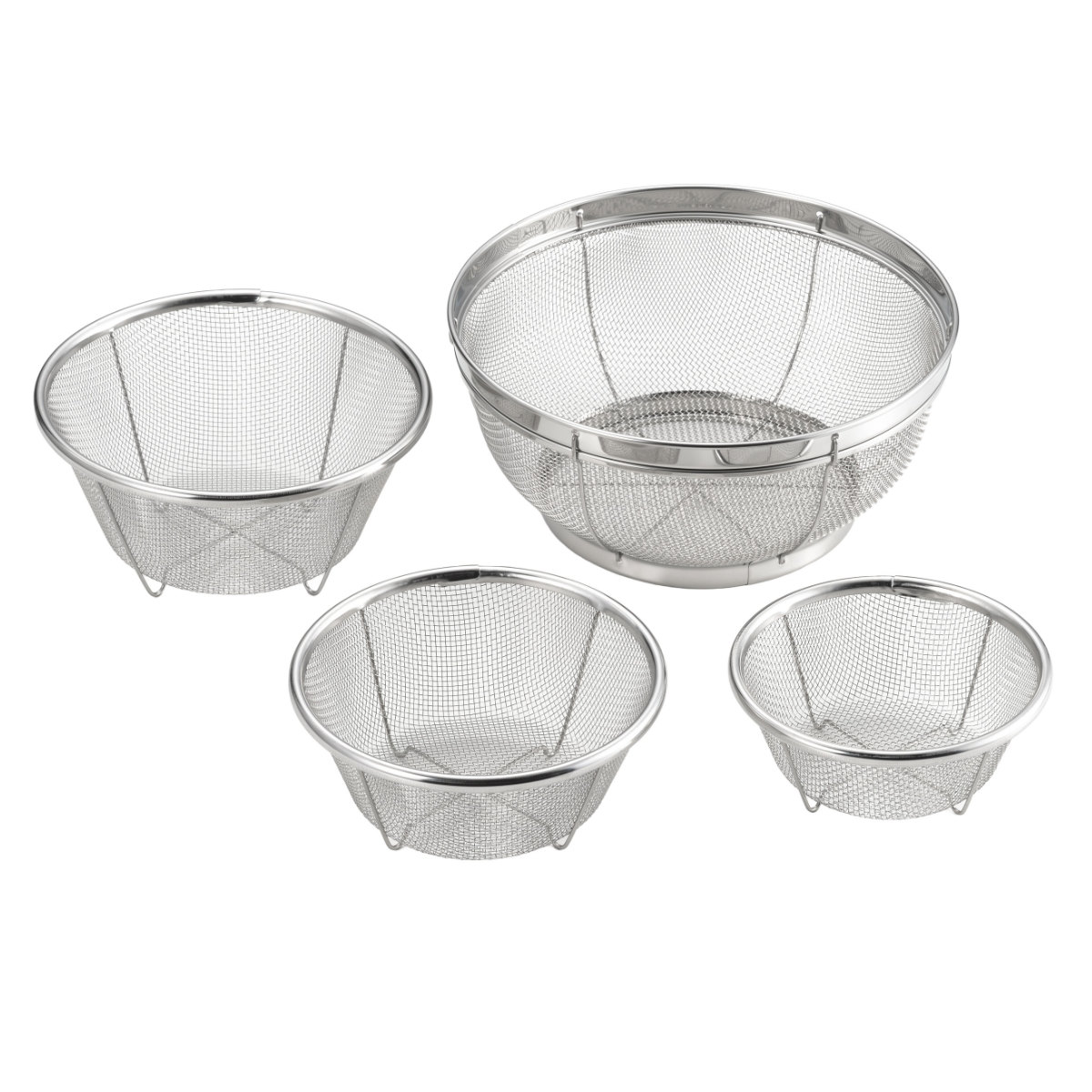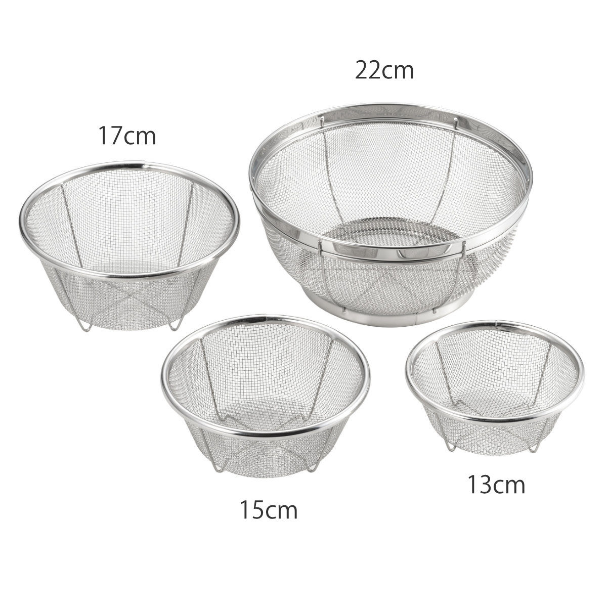 13cm・15cm・17cm・22cm、使いやすい大きさをまとめた4サイズセットです。果物や野菜の水切り、麺類の湯切りなどに重宝します。重ねて収納可能なので、場所を取りません。